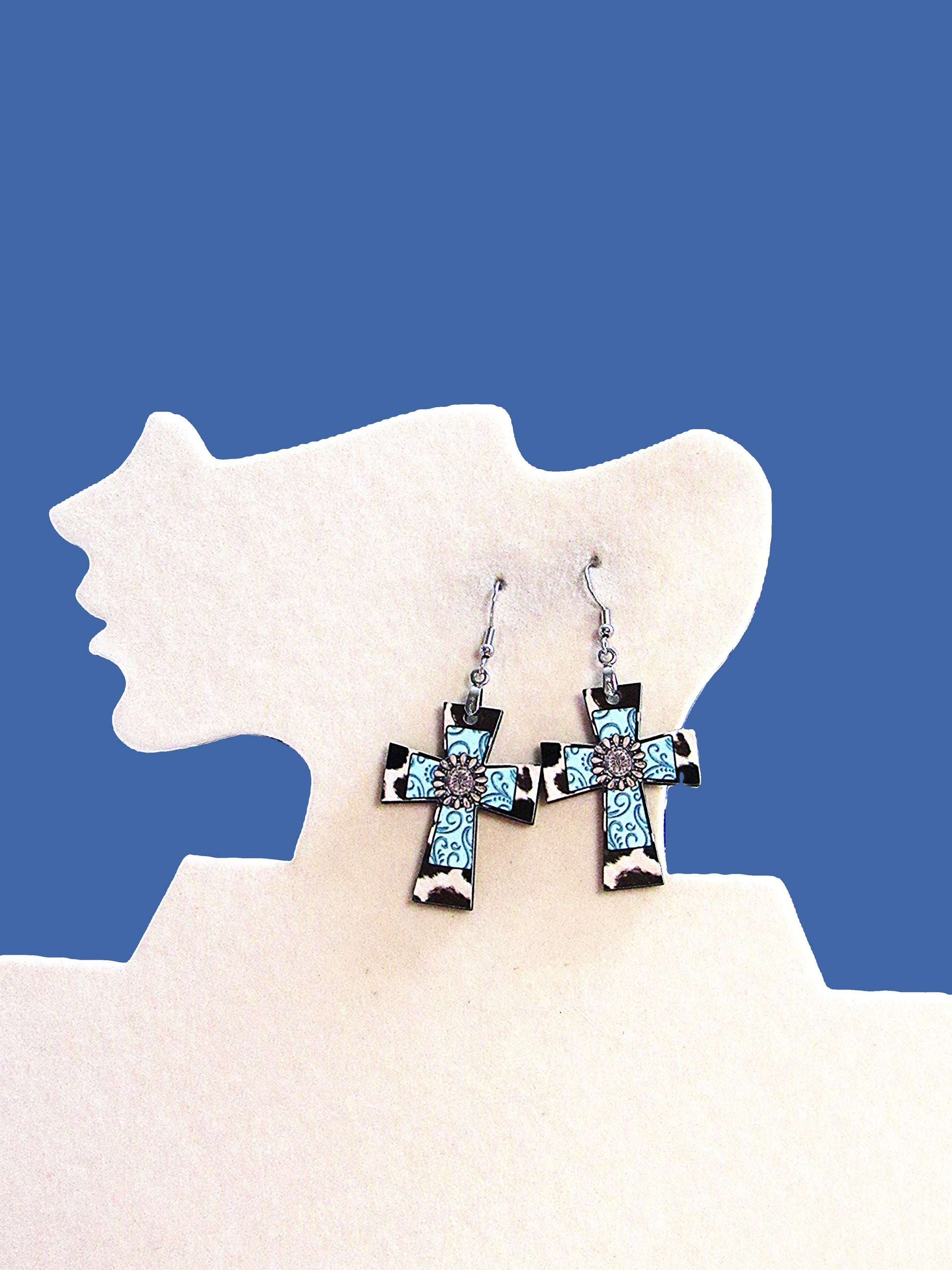 These cross-shaped earrings feature a 1.5-inch base and a total length of 2.5 inches, crafted from durable MDF with a hypoallergenic wire for comfortable wear. Designed with a Southwestern theme and accented by a cowhide border, they offer a unique, stylish accessory that complements a variety of outfits while being gentle on sensitive skin.