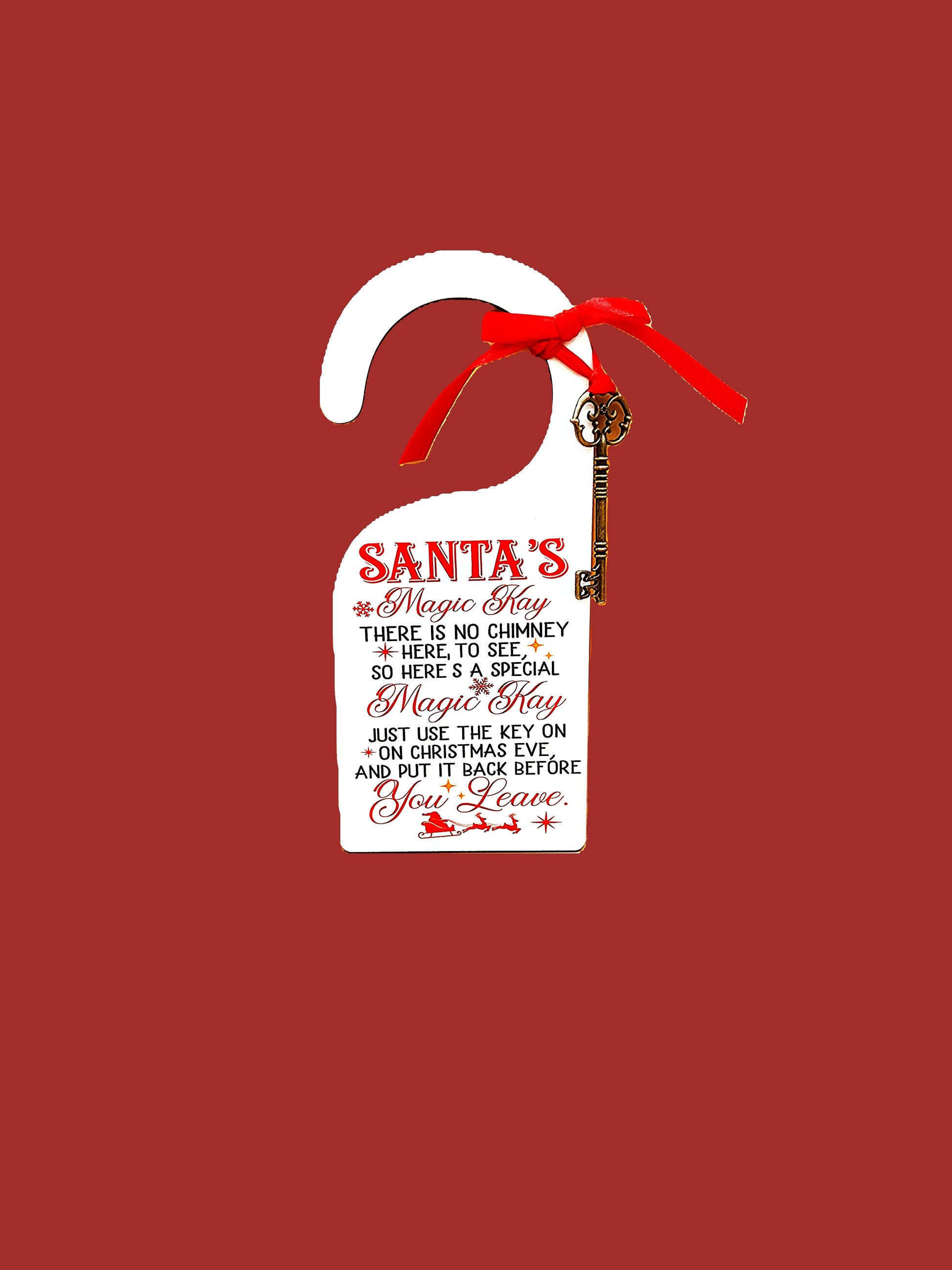 Add a touch of festive charm to your home with our Santa Key Door Tag! Made from durable and easy-to-hang sublimated MDF. A white MDF door tag with the text 'Santa's Magic Key' and a red ribbon.