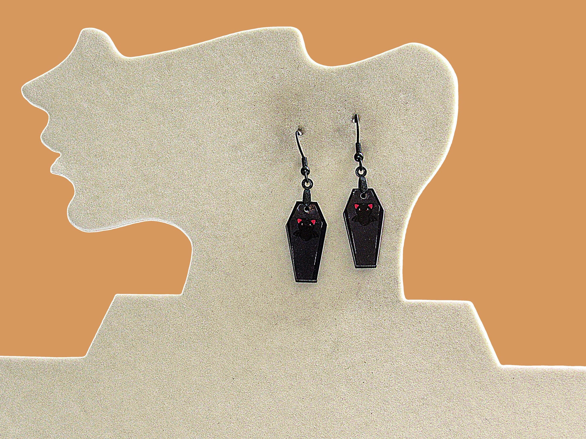 Add a dash of spooky charm with these coffin-shaped earrings! Made from sturdy 1.5 mm MDF with a total length of 2.5 inches, they’re lightweight and perfect for everyday wear. Featuring hypoallergenic wire, these playful earrings keep your ears happy while adding a fun, gothic flair to your look.
