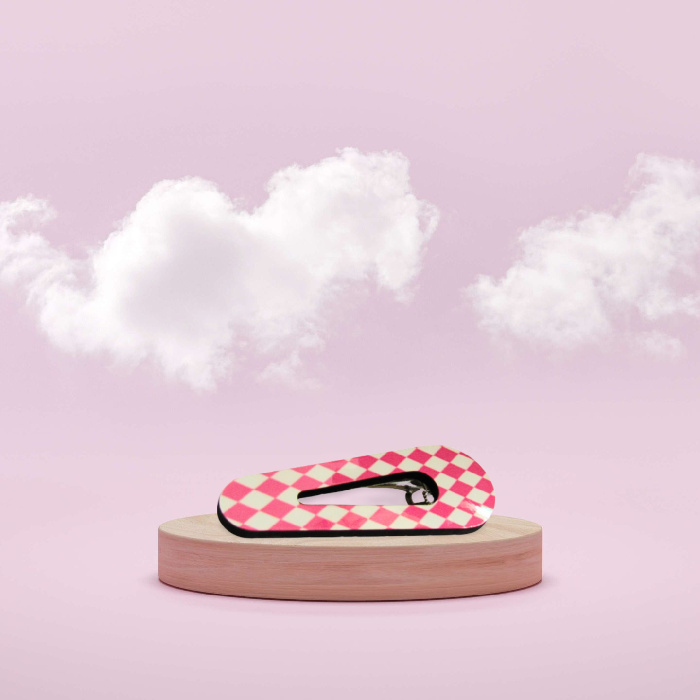 Add a pop of fun to your look with this 2.5-inch open triangle barrette! Made from sturdy MDF and secured with a metal alligator clip, it features a vibrant pink plaid design sublimated on one side. Perfect for holding your hair back with a playful, colorful twist.