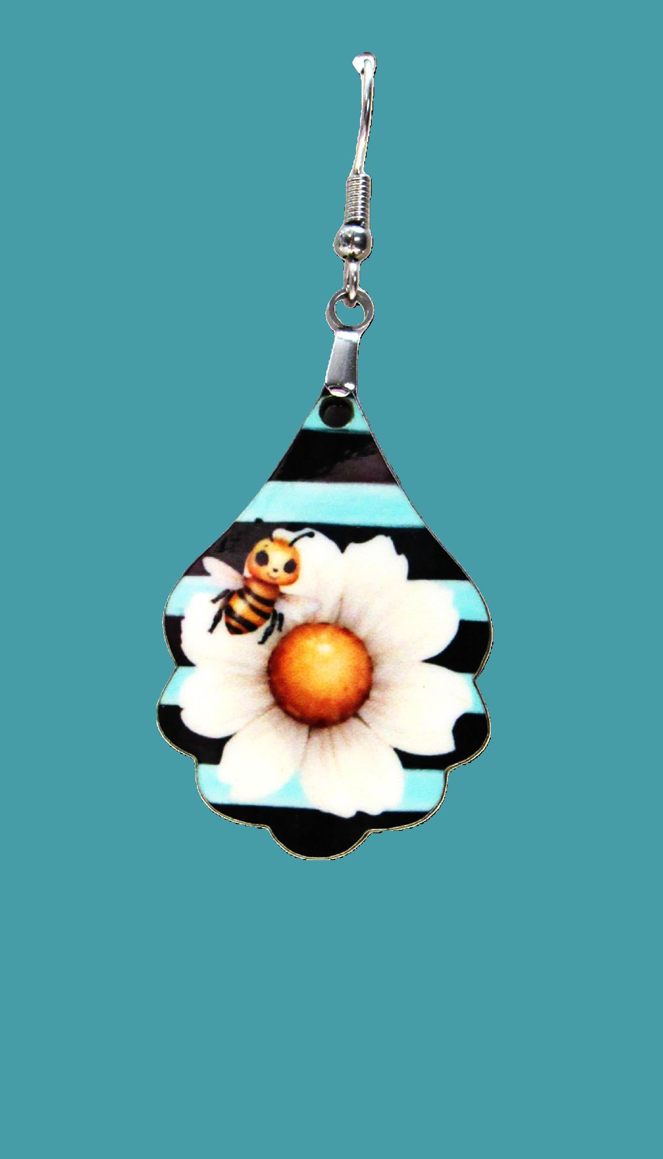 These Fancy Teardrop Shaped Sublimated Earrings feature a playful blue and black design with a buzzing bee and delicate flower. Measuring 1.5 inches wide and 2.5 inches long, they’re crafted from lightweight MDF and finished with hypoallergenic wire for comfortable all-day wear. Add a whimsical touch to your look with these charming earrings.
