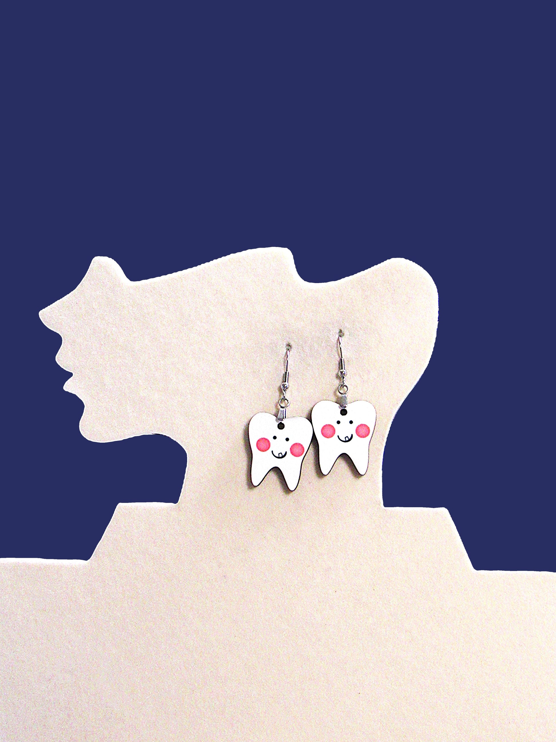 These tooth-shaped earrings feature a 1-inch base and a total length of 2 inches, crafted from durable MDF with hypoallergenic wire for sensitive ears. Their cheerful smiling design adds a playful touch to any outfit, making them a fun and comfortable accessory for everyday wear.