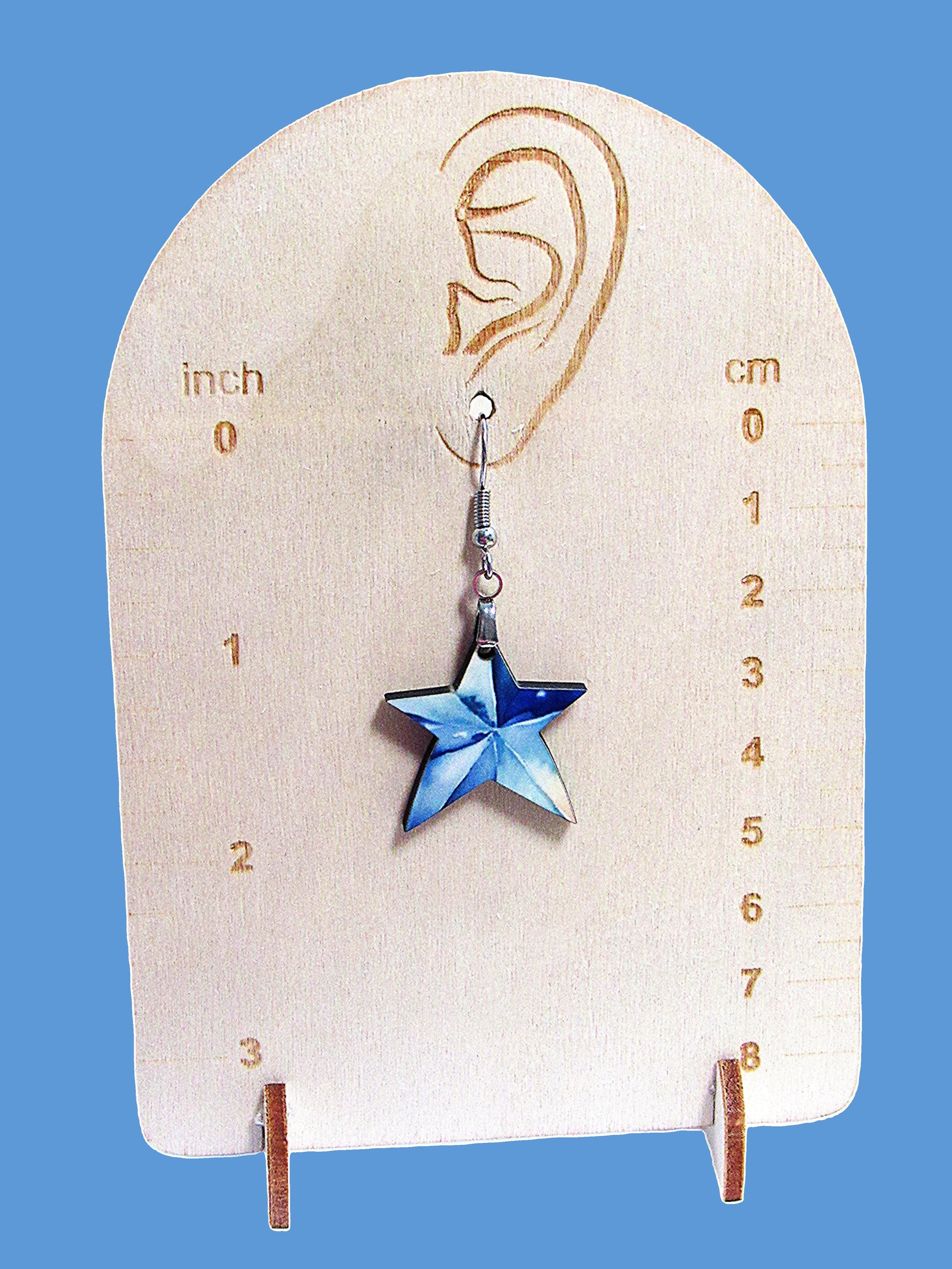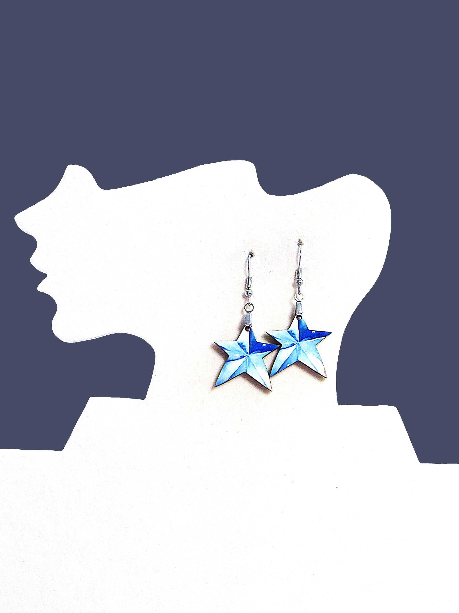 These star-shaped earrings sparkle with a playful charm, measuring 1 inch at the base and 2 inches in total length. Crafted from lightweight MDF and featuring hypoallergenic wire, they’re perfect for sensitive ears and add a fun, twinkling touch to any outfit.