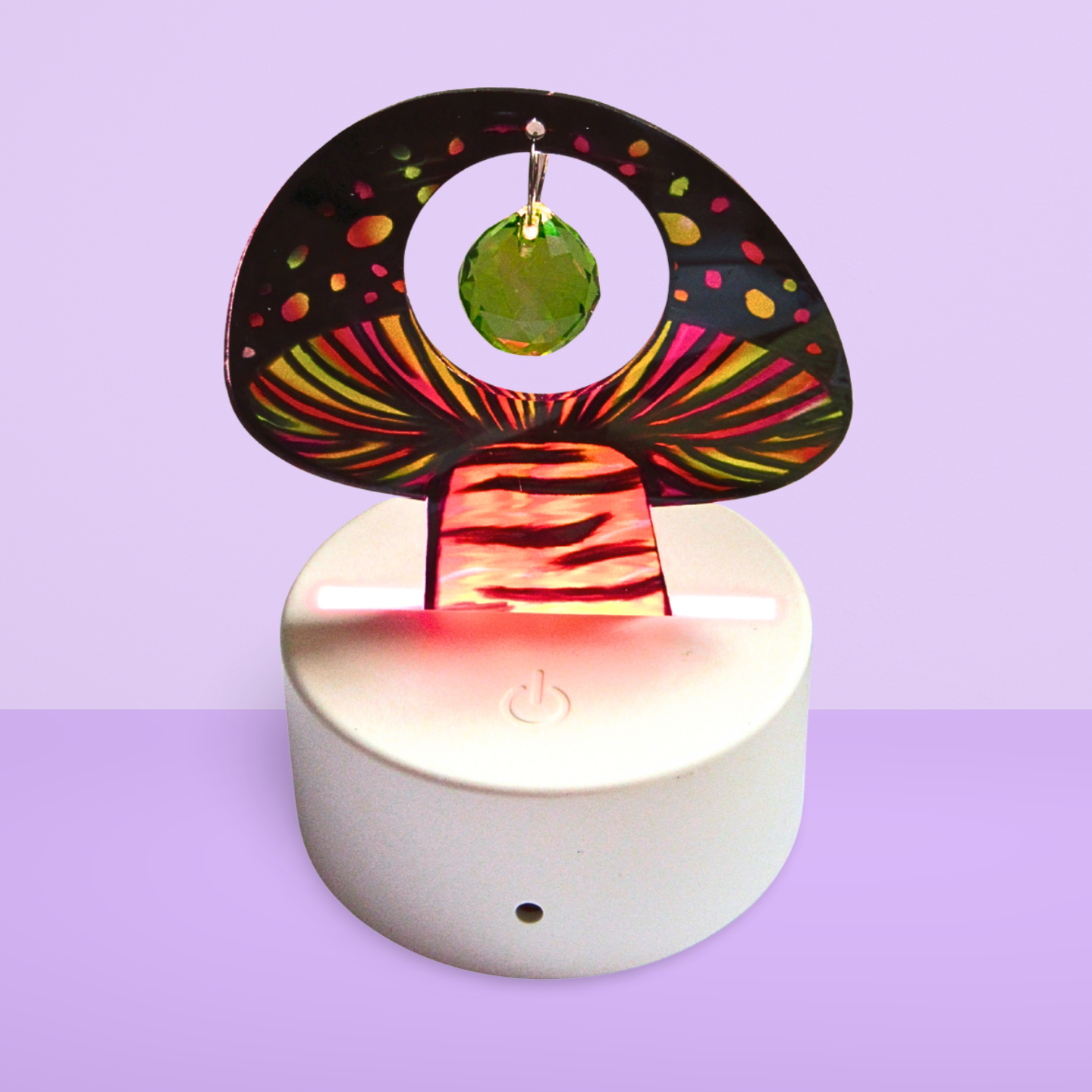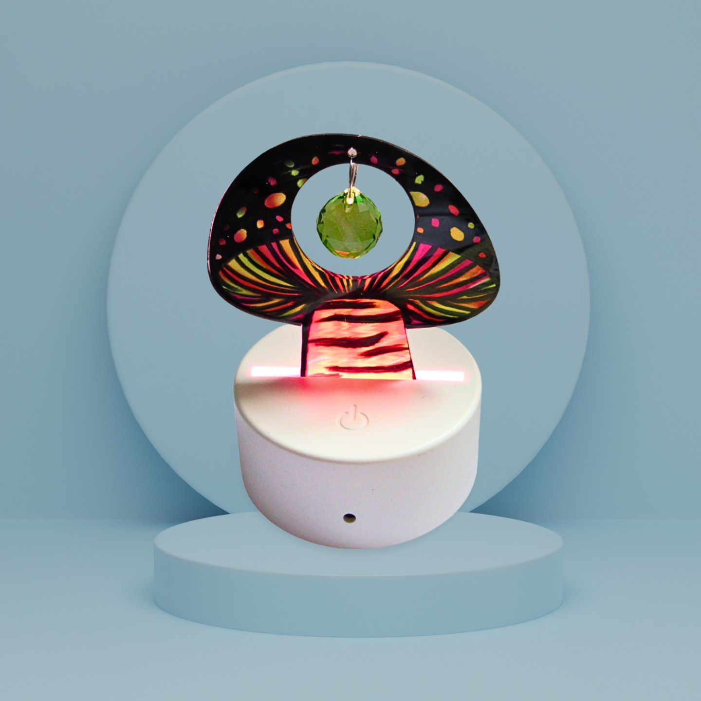 This 3.743 x 4.00 inch size inch Mushroom acrylic light features vibrant sublimation on one side, creating a beautiful illuminated display when paired with the included light base. Center hole with faceteted charm. Crafted from durable acrylic, it enhances any space with a subtle glow. Ideal for adding a warm, decorative touch wherever you need soft lighting.Enjoy flexible power options—use three AA batteries installed in the base or plug in the included USB cable for convenient LED illumination. Switch between vibrant colors effortlessly with the touch-activated button or handheld remote control. Whether you're decorating a shelf, desk, or craft space, this versatile light base brings warmth and holiday cheer to any room.