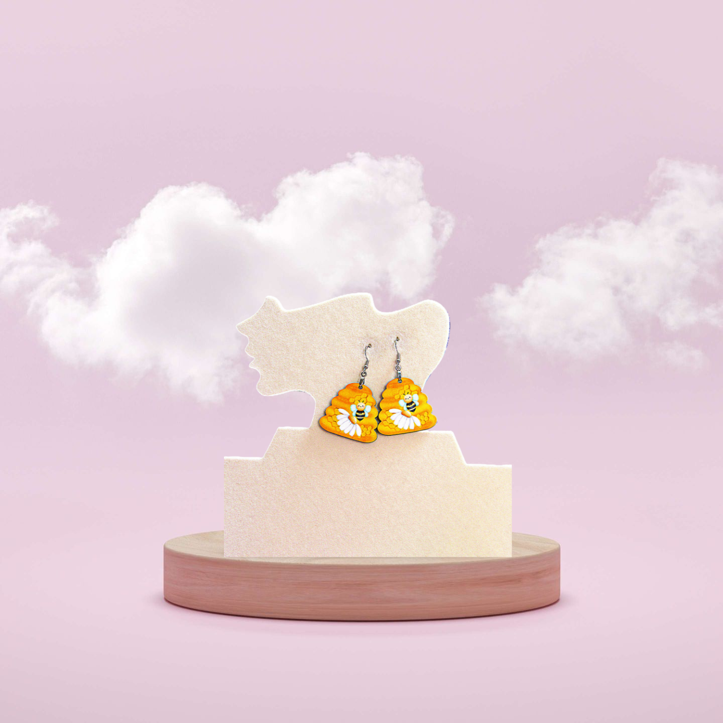These beehive-shaped earrings combine style and comfort with a 1.5-inch base and a total length of 2.5 inches. Crafted from durable MDF and featuring hypoallergenic wire, they are perfect for sensitive ears. Add a unique, nature-inspired touch to your look while enjoying lightweight, irritation-free wear all day long.