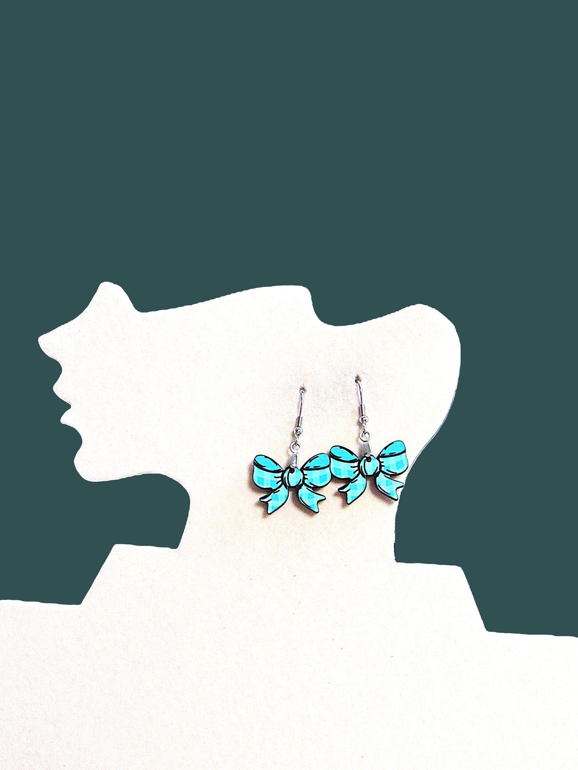 These playful bow-shaped earrings measure 1 inch at the base with a total length of 2 inches, crafted from lightweight MDF for comfortable wear. Featuring hypoallergenic wire, they’re perfect for sensitive ears, adding a fun and charming touch to any outfit.