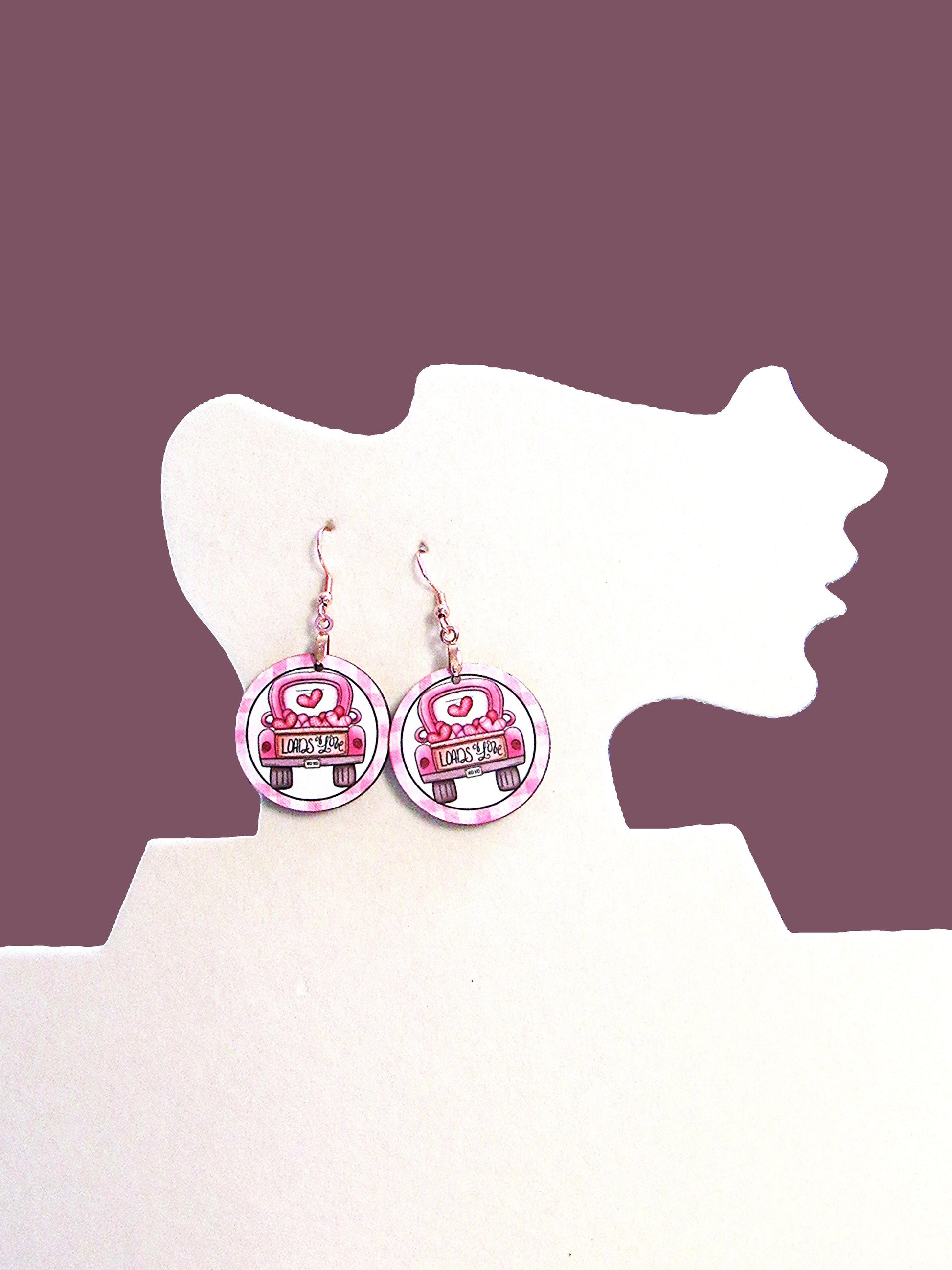 These playful round-shaped sublimated earrings feature a 1-inch MDF base and measure 2 inches in total length. Made with hypoallergenic wire for comfortable wear, they showcase a cute Valentine truck design that adds a fun and festive touch to your look.