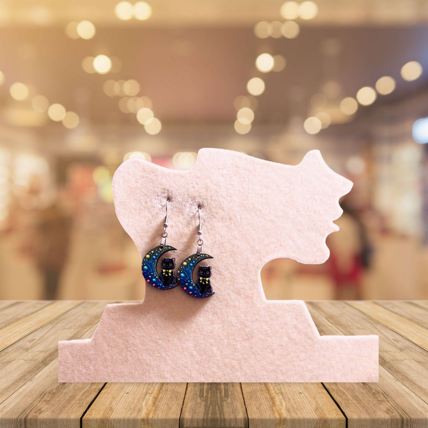 Make a statement with these captivating Cat on Moon Shaped Sublimated Earrings. Measuring 2 inches in total length with a 1-inch earring detail, they feature a striking black cat perched on a crescent crystal moon crafted from lightweight MDF. The hypoallergenic wire ensures comfortable wear for sensitive ears, combining style and safety effortlessly. Perfect for those who love unique accessories with a touch of whimsy.