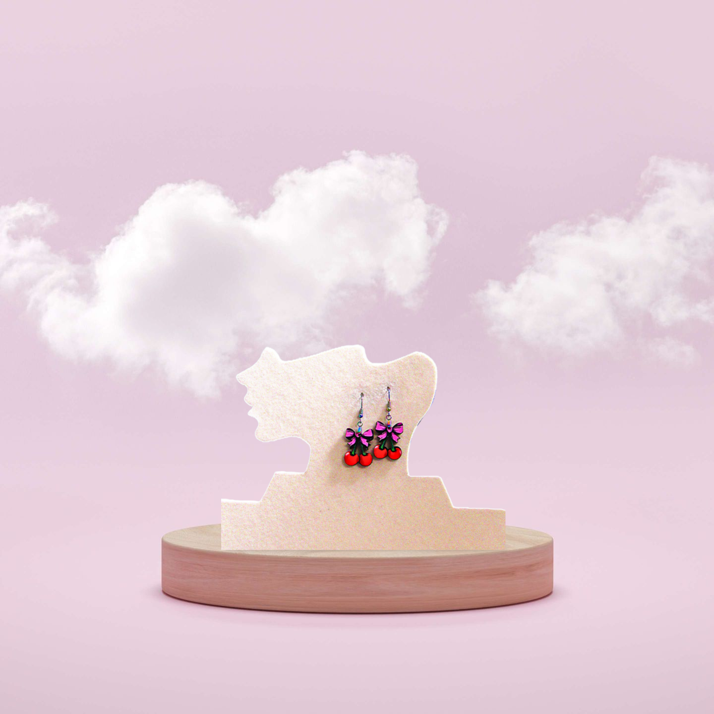Add a playful pop to your look with these cherries and pink bow earrings. Crafted from sturdy 1-inch MDF and measuring 2 inches long, they feature vibrant sublimation on one side for eye-catching color. The hypoallergenic wire ensures comfortable wear all day, making these sweet, quirky earrings perfect for fun outings or anytime you want to brighten your style.