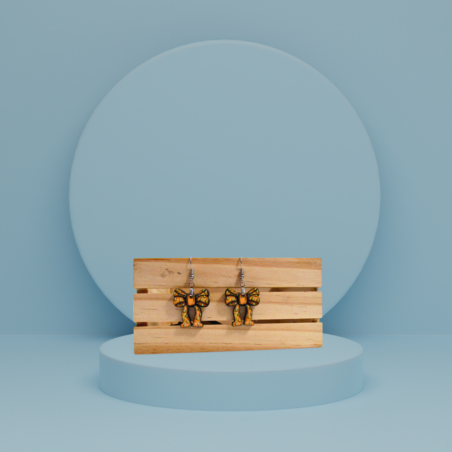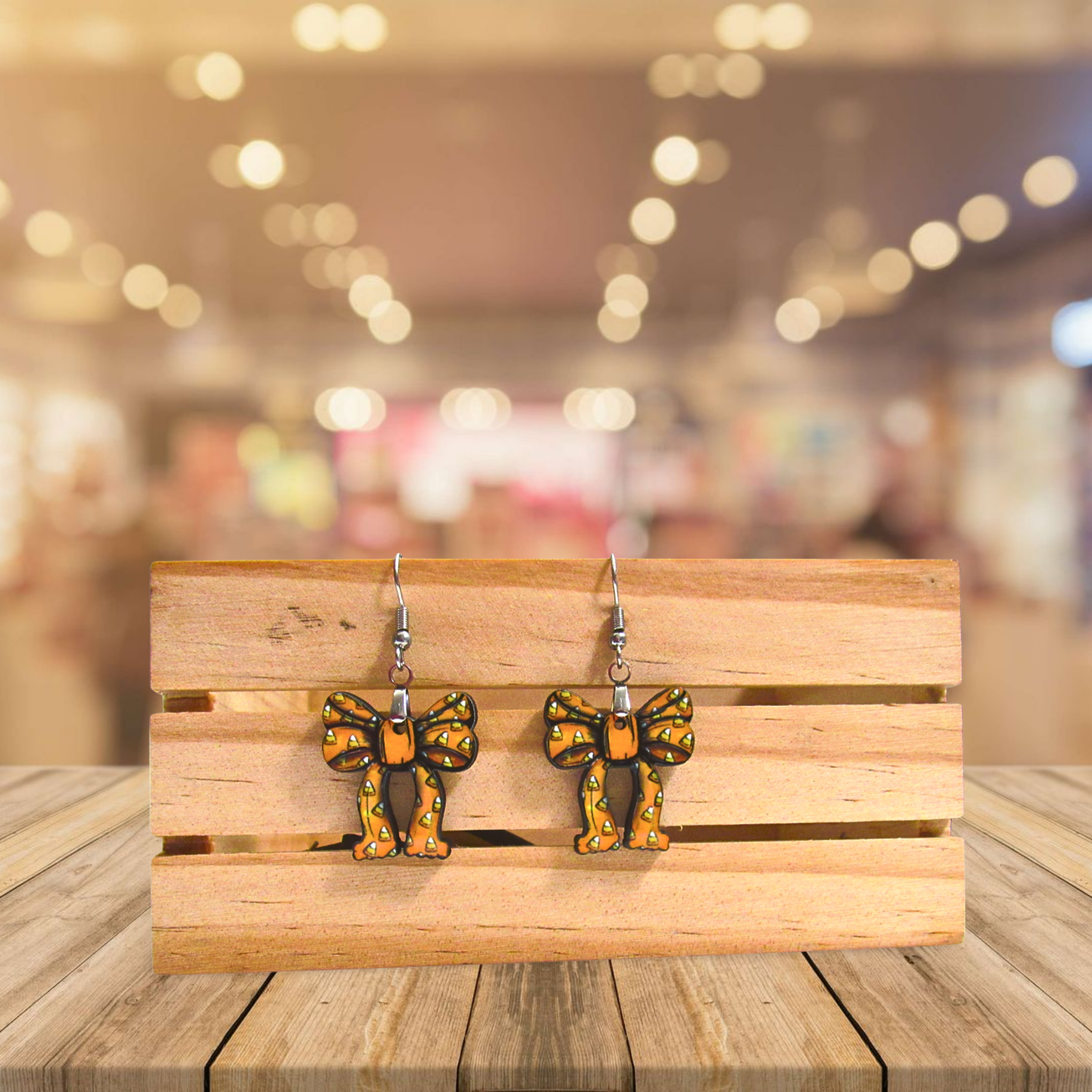 Celebrate the season with these playful Christmas Bow Shaped Sublimated Earrings! Crafted from sturdy MDF, each earring measures 1 inches with a total drop of 2 inches, featuring a vibrant orange bow adorned with a fun candy corn print. Sublimated on one side for lasting color, they hang from hypoallergenic wires, perfect for sensitive ears. Add a sweet and festive touch to your holiday look!