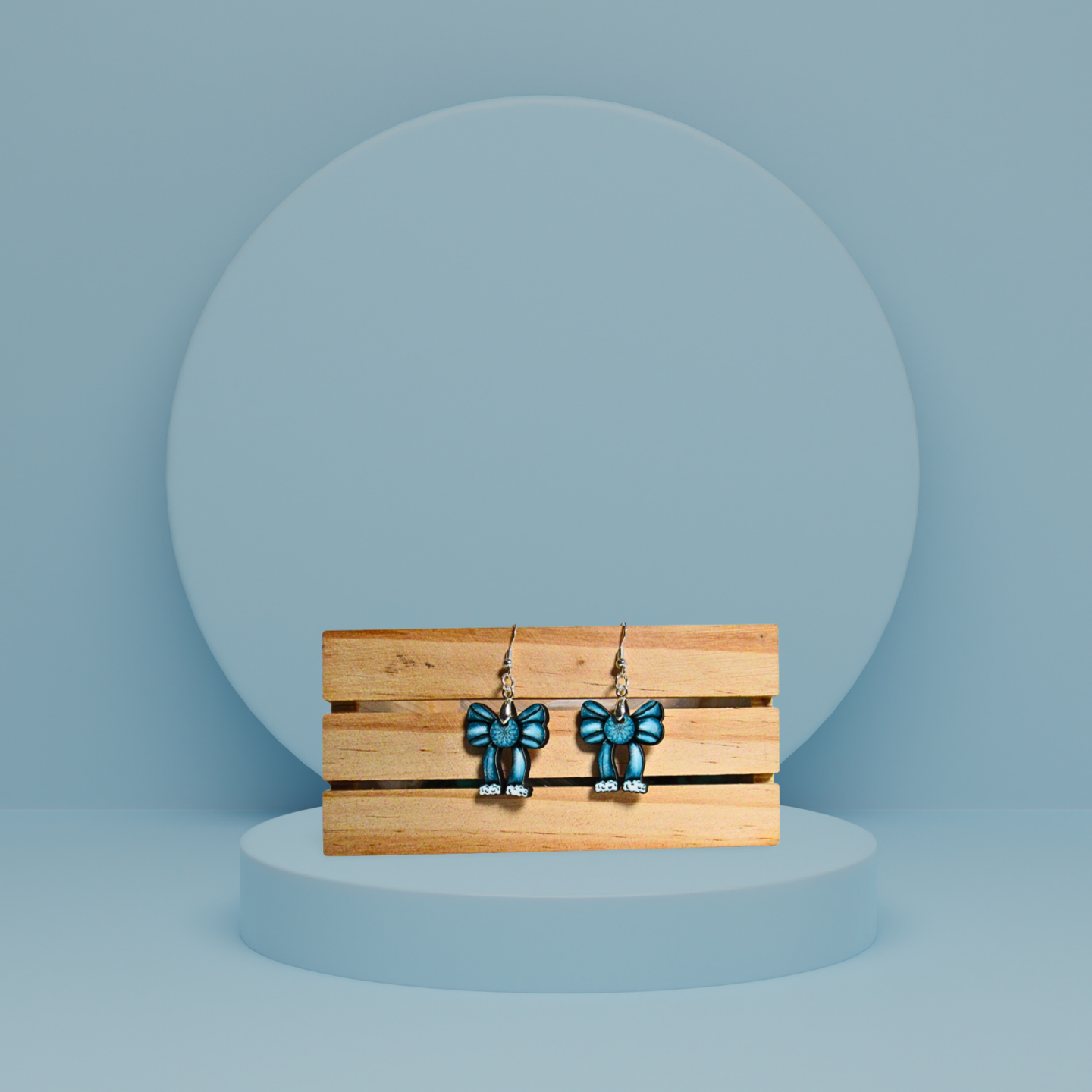 Celebrate the season with these playful Christmas Bow Shaped Sublimated Earrings! Crafted from sturdy MDF, each earring measures 1 inches with a total drop of 2 inches, featuring a vibrant Blue print Sublimated on one side for lasting color, they hang from hypoallergenic wires, perfect for sensitive ears. Add a sweet and festive touch to your holiday look!