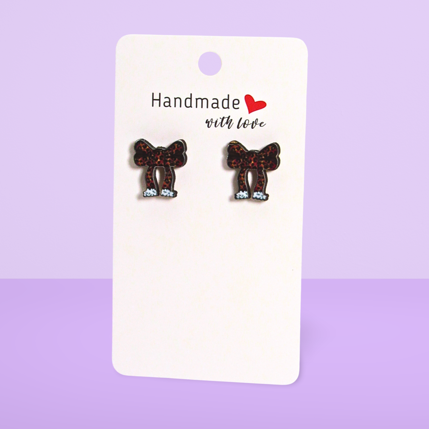 Celebrate the season with these playful Christmas Bow Shaped Sublimated Stud Earrings! Crafted from sturdy MDF, featuring a vibrant glittery leopard print Sublimated on one side for lasting color, they hang from hypoallergenic studs, perfect for sensitive ears. Add a sweet and festive touch to your holiday look!