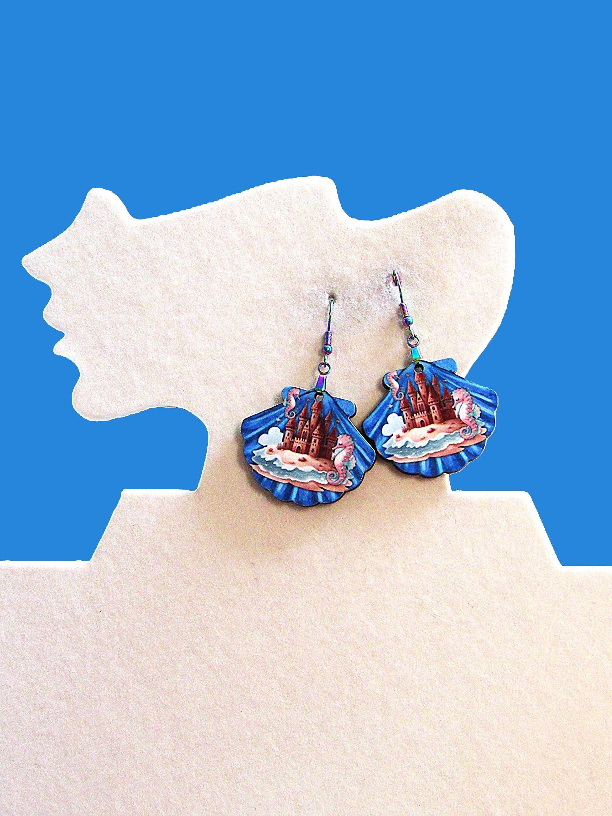These clam shell shaped earrings measure 1.5 inches at the base with a total length of 2.5 inches, crafted from durable MDF material. Featuring hypoallergenic wire, they offer comfort for sensitive ears. The design showcases a charming blue shade accented with a delicate sandcastle motif, perfect for adding a touch of seaside inspiration to your look.