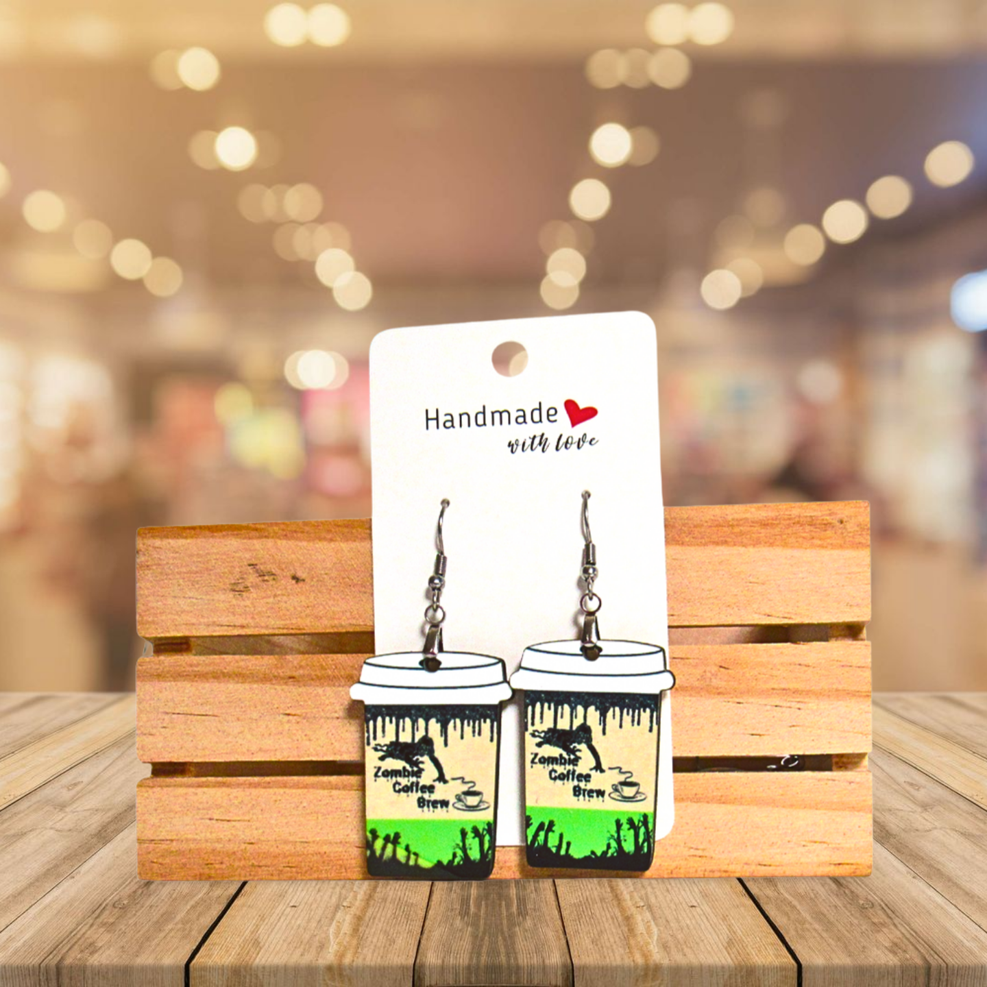 Add a dash of spooky charm to your style with these Coffee To GO Cup shaped earrings! Crafted from lightweight MDF, each earring measures 1.5 inches wide and 2.5 inches long, featuring vibrant sublimation on one side with the fun "Zombie Coffee Brew" design. Finished with hypoallergenic wires, they’re perfect for sensitive ears and make a playful statement for any coffee lover who enjoys a little Halloween flair.