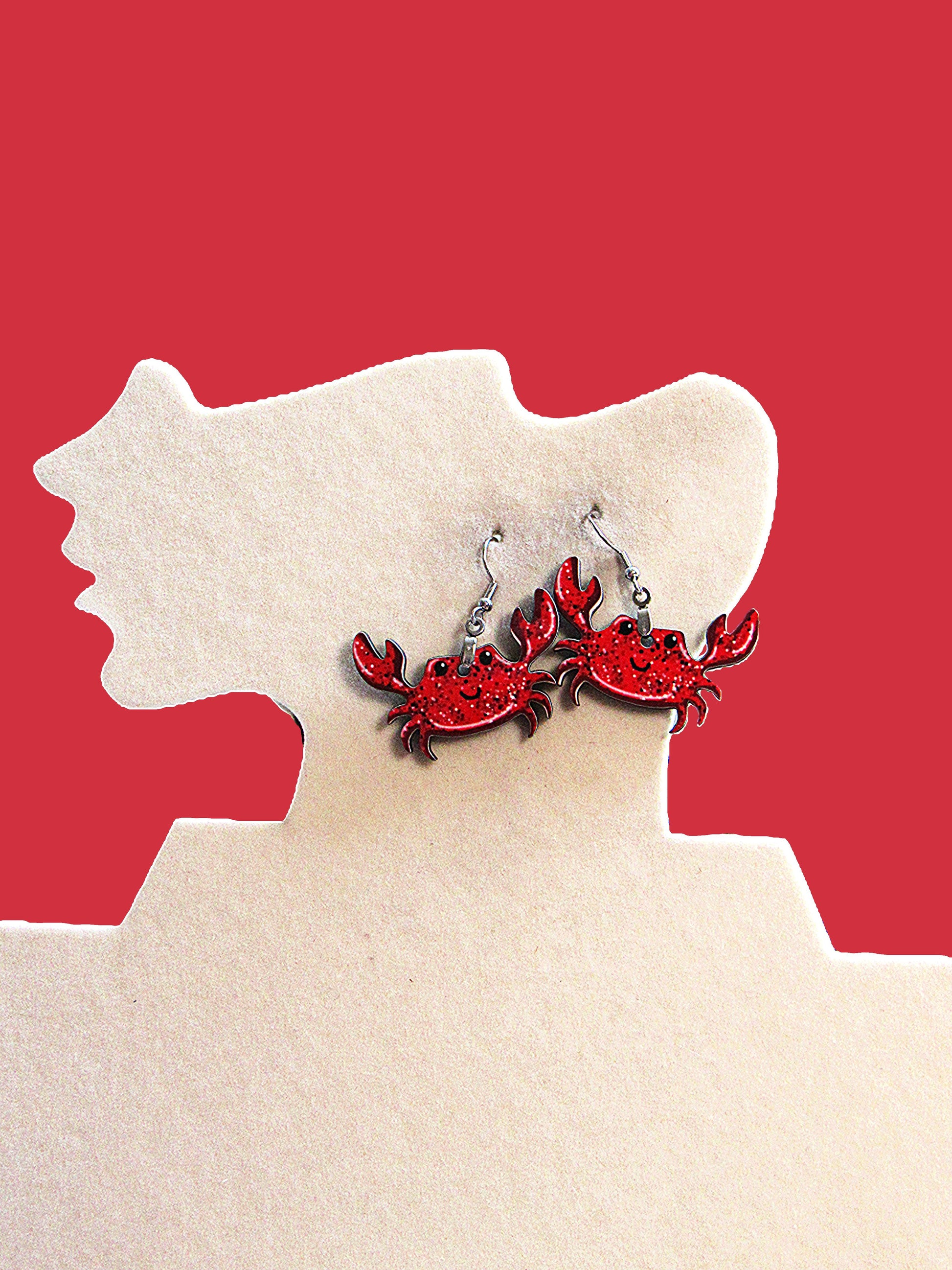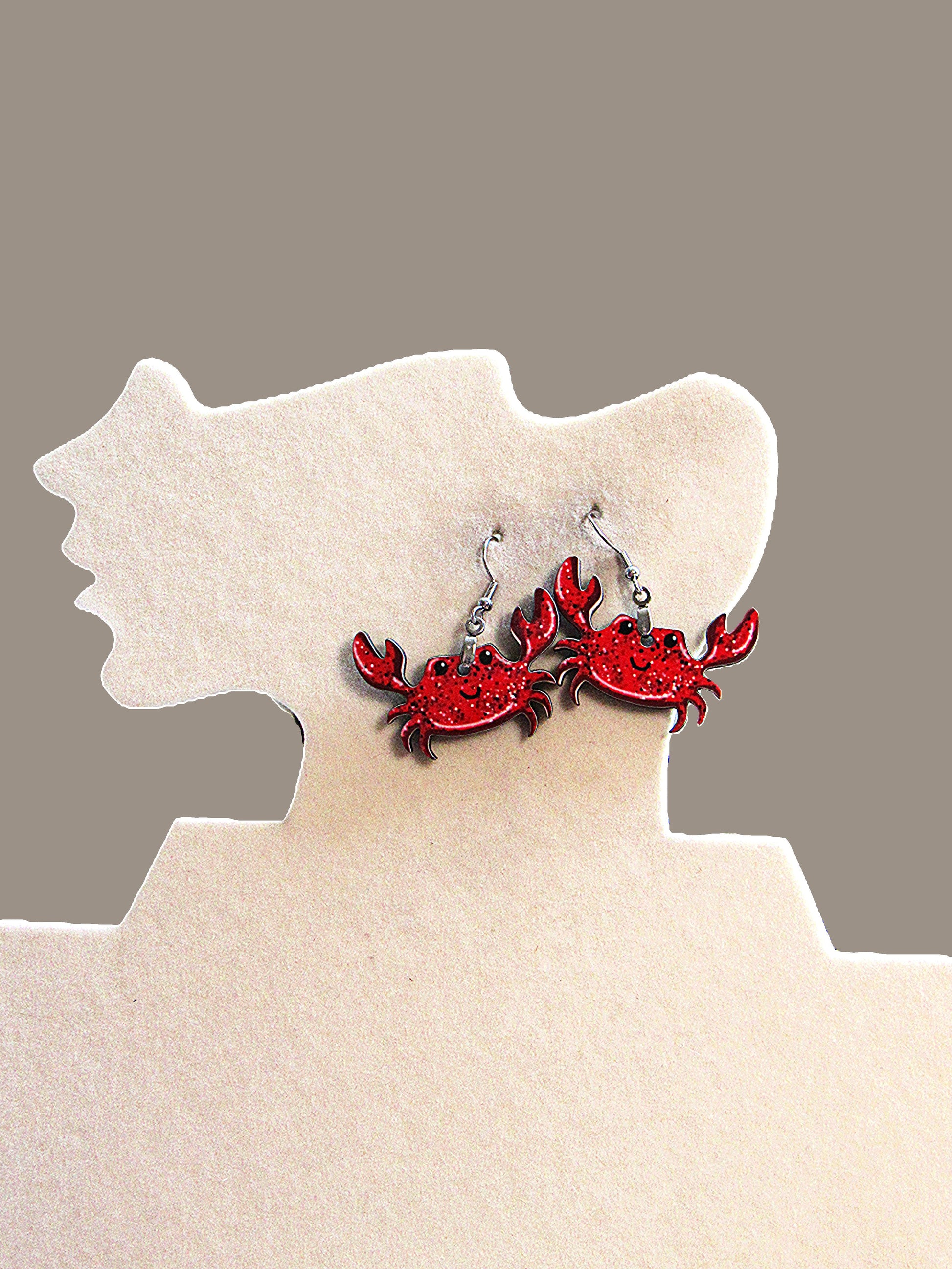 These crab-shaped sublimated earrings feature a 1.5-inch wide base and a total length of 1.75 inches for a balanced, comfortable fit. Crafted from MDF and equipped with hypoallergenic wire, they offer a skin-friendly option for sensitive ears. The vibrant red color adds a playful touch to any outfit while ensuring lasting wear.