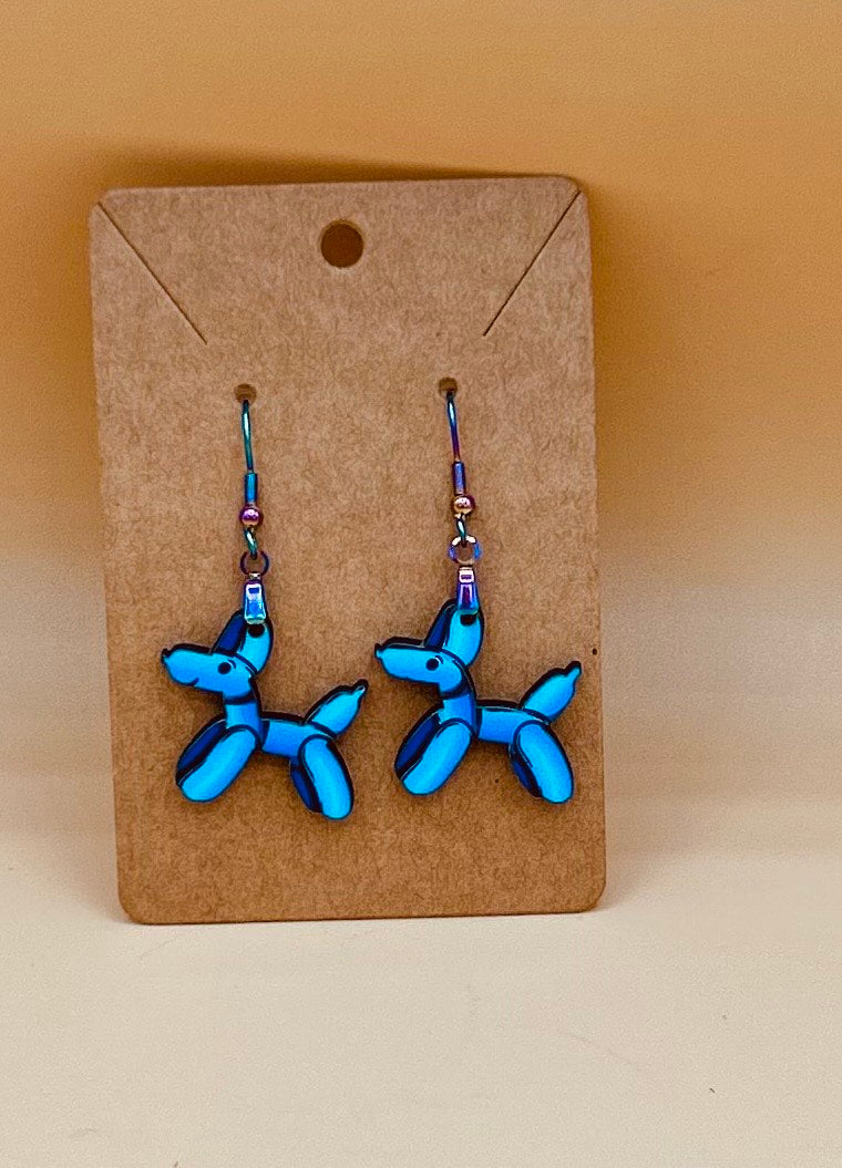 These playful dog balloon-shaped earrings bring a fun pop of charm to any outfit. Crafted from durable MDF with hypoallergenic wire, they measure 1 inch at the base and 2 inches in total length, making them lightweight and comfortable for all-day wear. Perfect for dog lovers who want to add a whimsical touch to their style!
