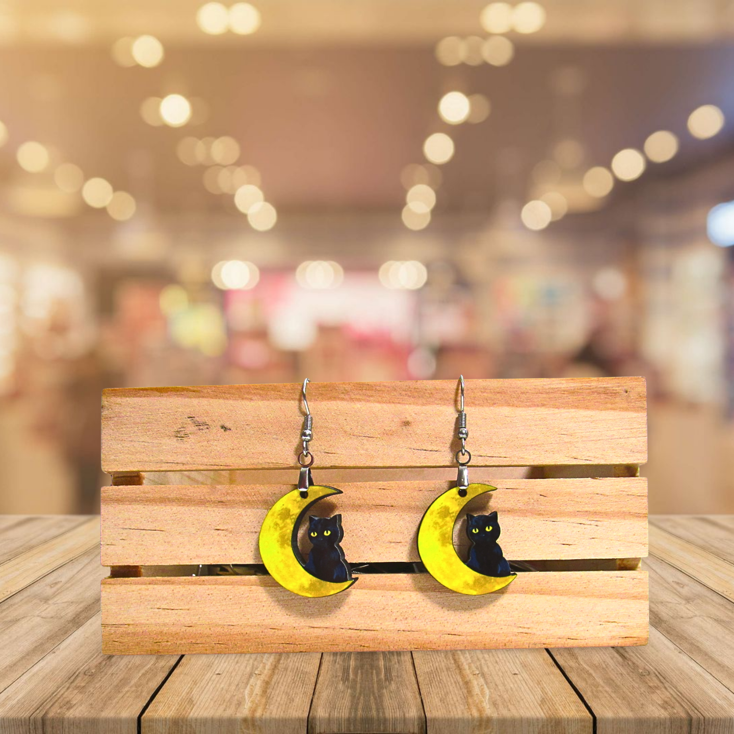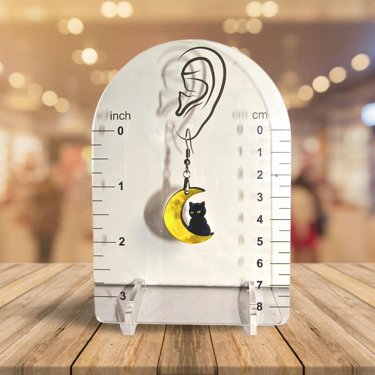 Make a statement with these captivating Cat on Moon Shaped Sublimated Earrings. Measuring 2 inches in total length with a 1-inch earring detail, they feature a striking black cat perched on a crescent moon crafted from lightweight MDF. The hypoallergenic wire ensures comfortable wear for sensitive ears, combining style and safety effortlessly. Perfect for those who love unique accessories with a touch of whimsy.