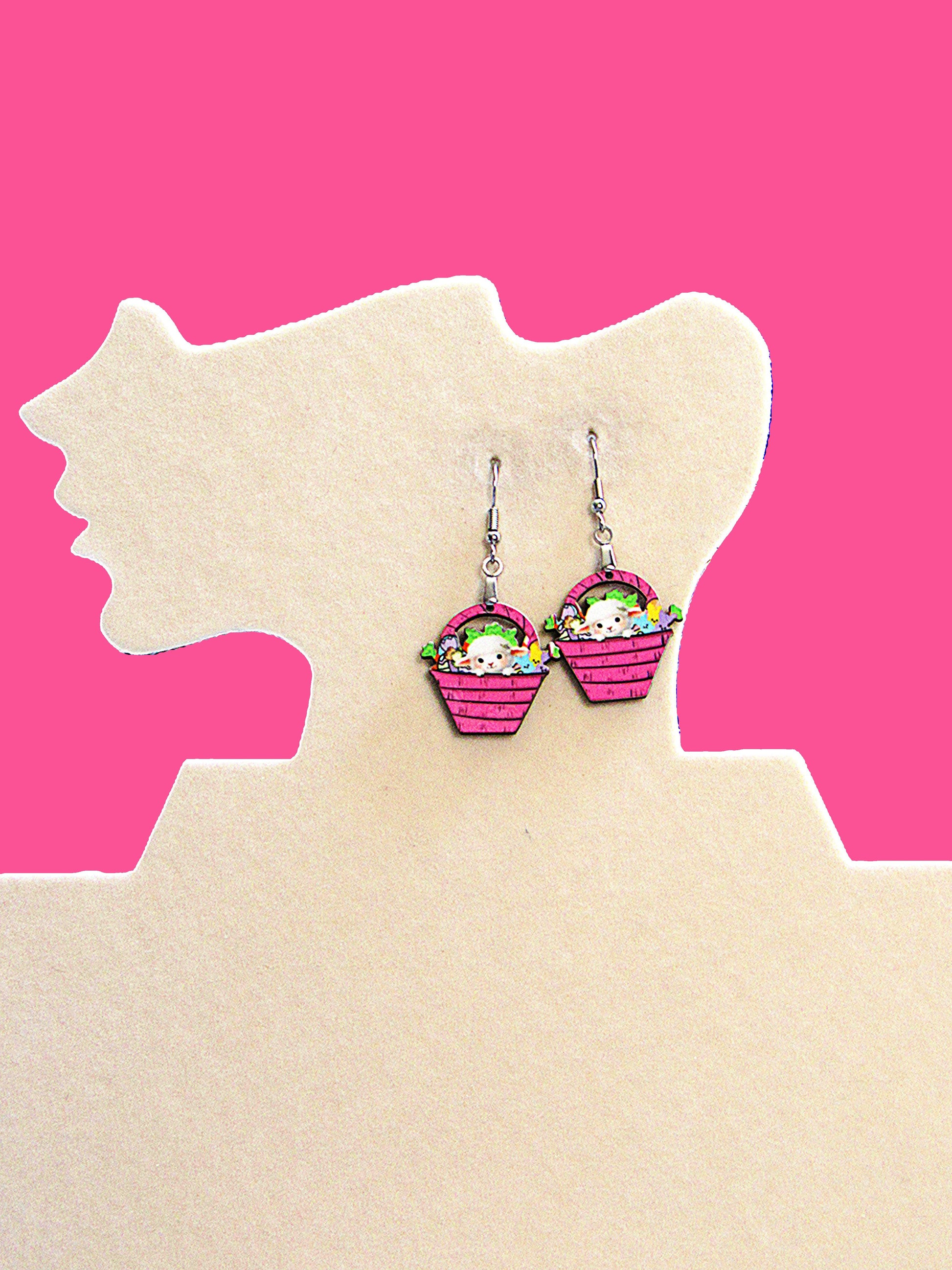 These basket-shaped sublimated earrings feature a compact 1-inch base and a total length of 2 inches, crafted from durable MDF material. Designed with hypoallergenic wire, they ensure comfortable wear for sensitive ears. Their unique shape and quality construction make them a stylish and safe accessory for everyday use.