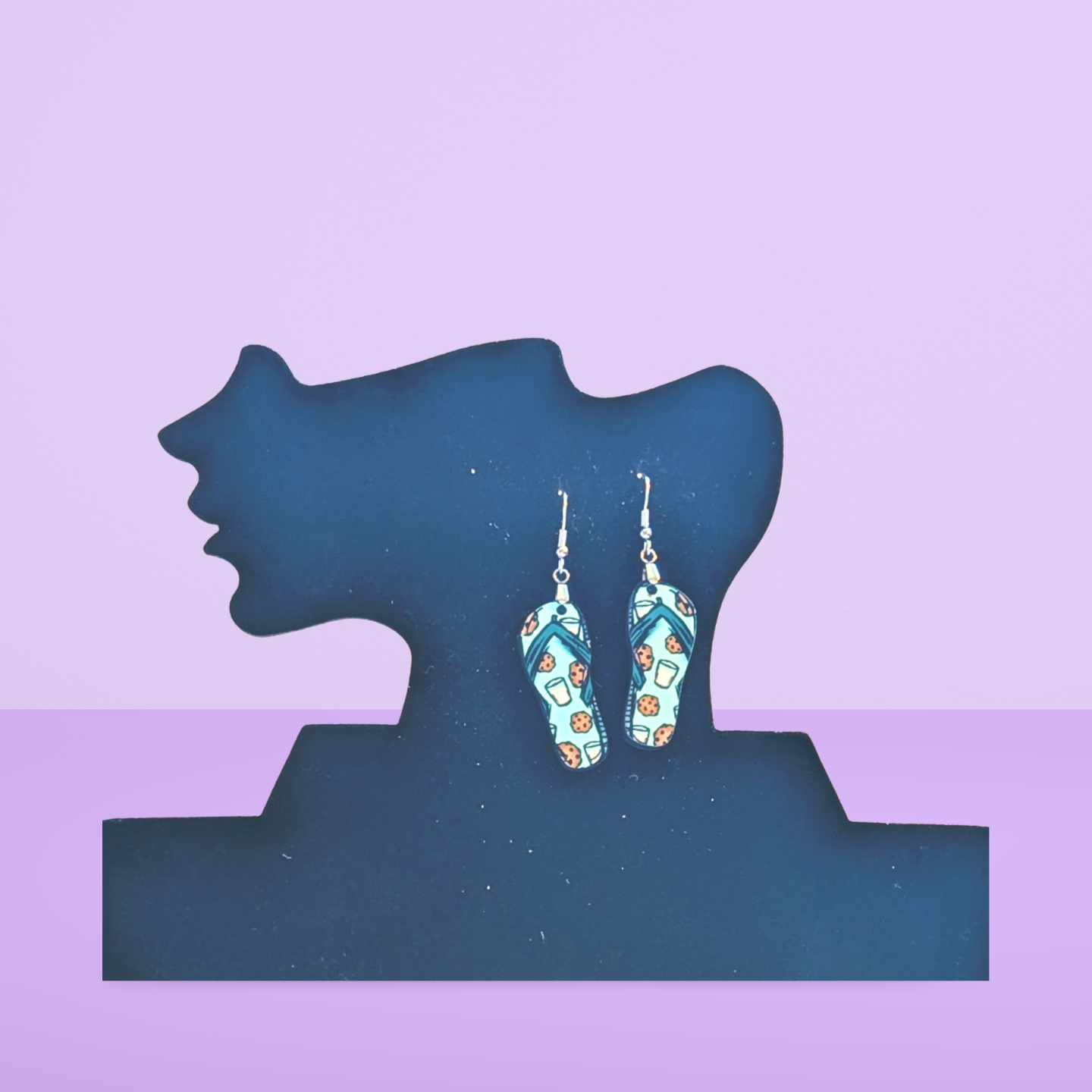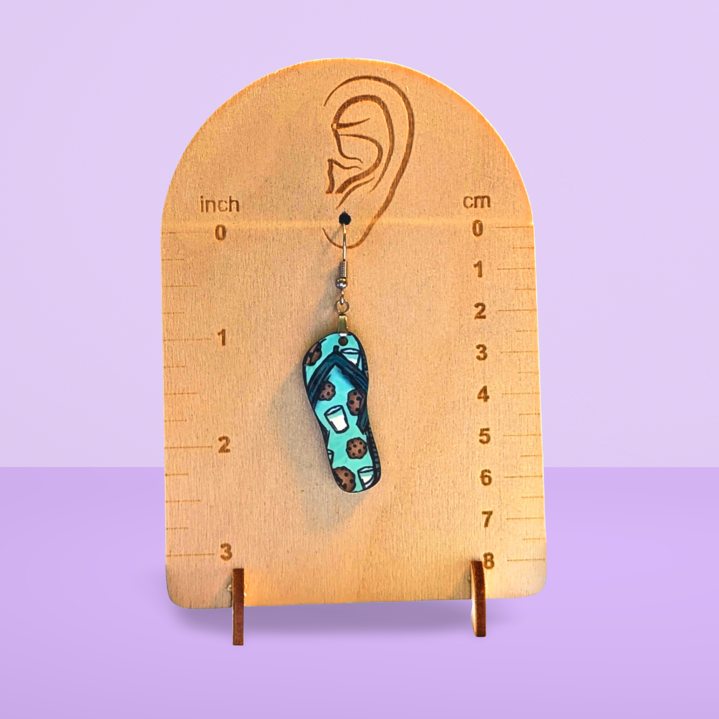 Treat your ears to these adorable Flip Flop Shaped Earrings featuring a delightful cookies and milk print! Made from lightweight MDF, each earring measures 1.5 inches with a total length of 2.5 inches. The design is sublimated on one side, showcasing fun, colorful details. Finished with hypoallergenic wire, these earrings offer all-day comfort with a playful, tasty twist perfect for adding a sprinkle of whimsy to any outfit.