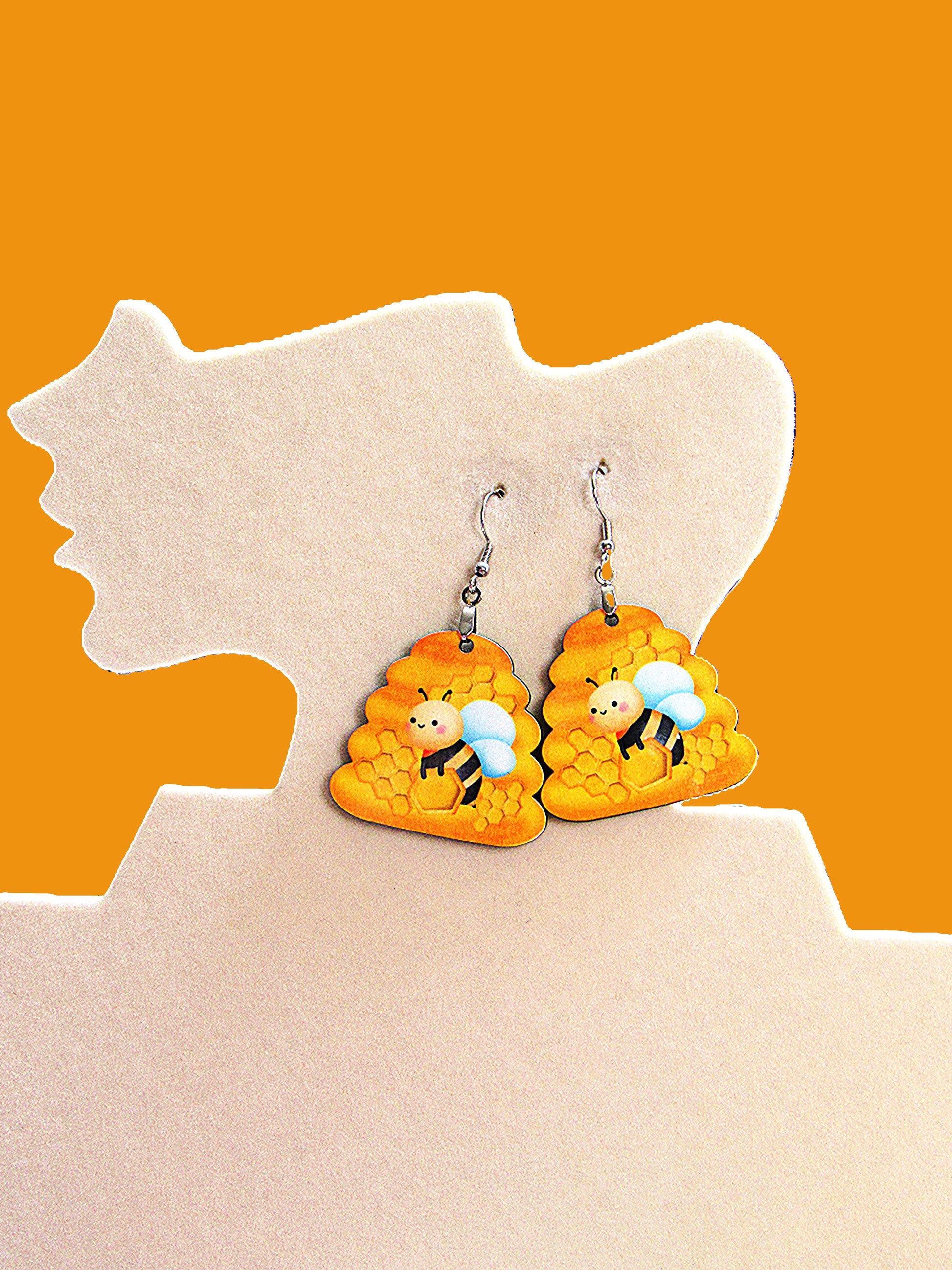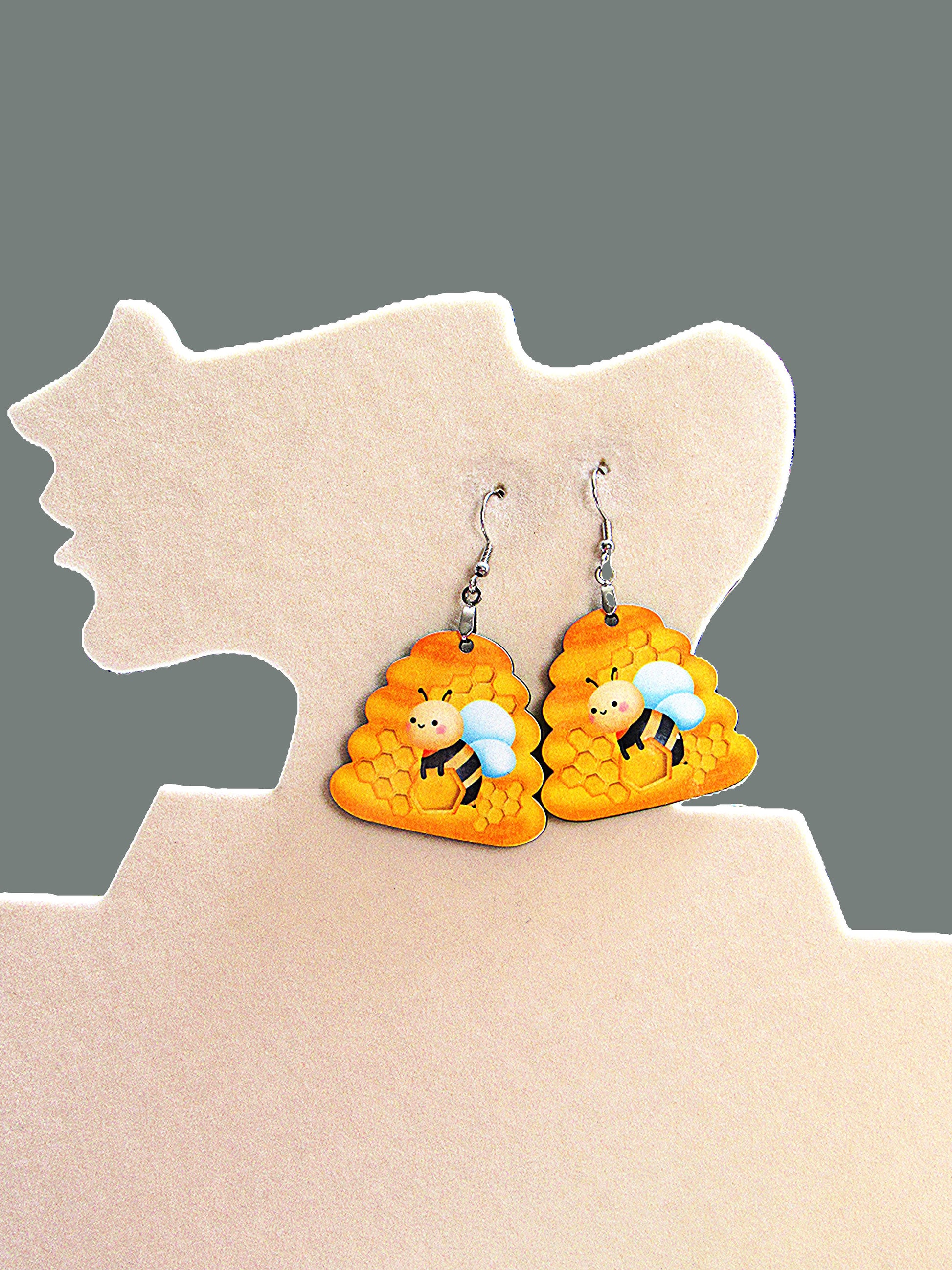 These beehive-shaped earrings combine style and comfort with a 1.5-inch base and a total length of 2.5 inches. Crafted from durable MDF and featuring hypoallergenic wire, they are perfect for sensitive ears. Add a unique, nature-inspired touch to your look while enjoying lightweight, irritation-free wear all day long.