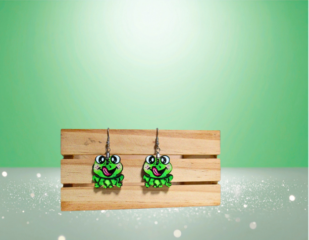 Hop into style with these charming frog-shaped earrings! Crafted from lightweight MDF with vibrant sublimated design on one side, they're a playful addition to any collection. Featuring hypoallergenic stainless steel wires, these earrings are comfortable for sensitive ears and perfect for all-day wear. At 1 inch in length with a total drop of 2 inches, they make a delightful statement without being overwhelming. Whether you're a nature lover or just love quirky accessories, these little amphibians are sure to bring a smile!
