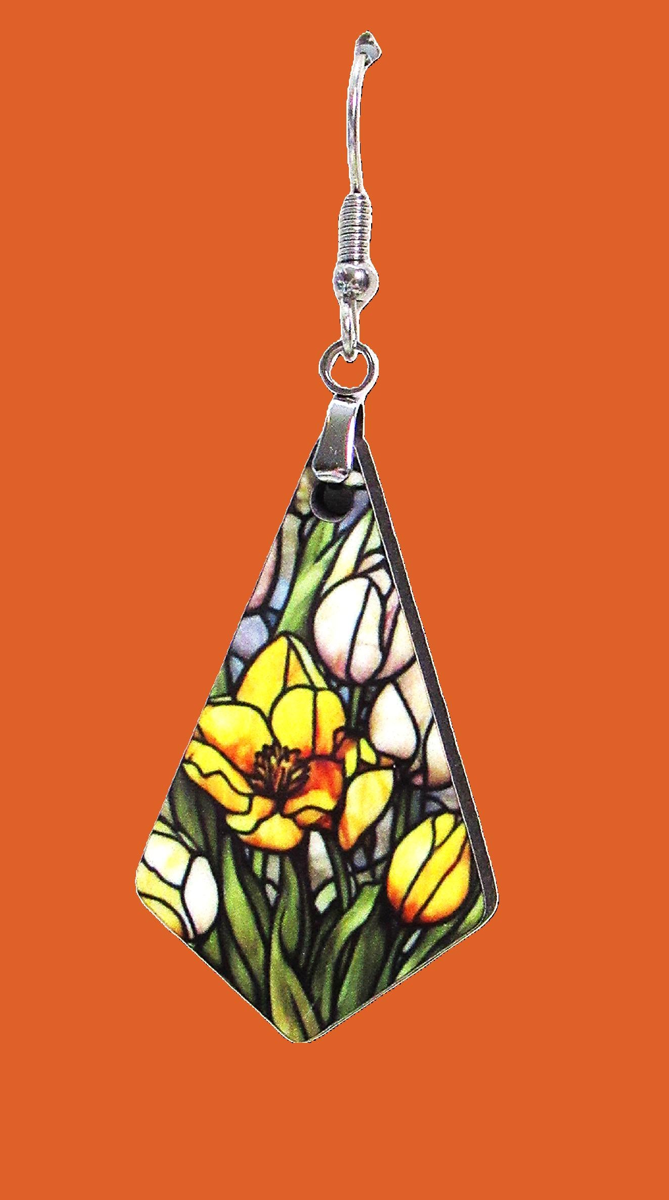 These playful earrings feature a vibrant yellow flower design with a stained glass effect, bringing a sunny touch to your style. Crafted from lightweight MDF with hypoallergenic wire, they offer comfortable wear. Measuring 1.5 inches wide and 2.5 inches in total length, these Boho Geometric Earrings add a fun, artsy flair to any outfit.
