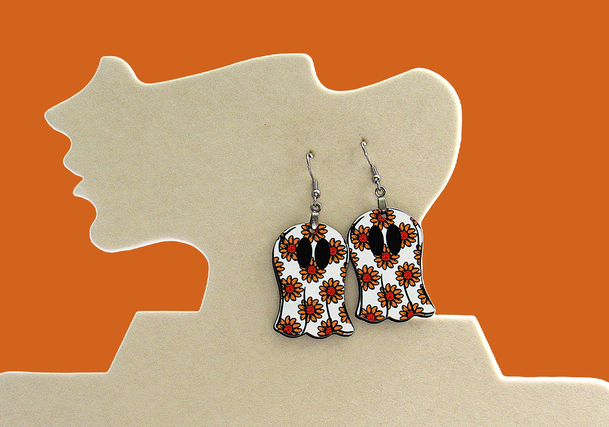 Crafted from durable MDF with a sturdy 1.5-inch base and a total length of 2.5 inches, these ghost-shaped sublimated earrings offer a unique, eye-catching accessory. Featuring hypoallergenic wire, they ensure comfortable wear for sensitive ears while adding a playful, spooky touch to any outfit. Perfect for those seeking style without compromise.
