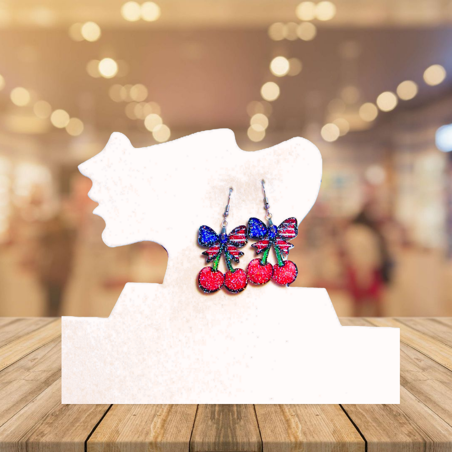 Add a splash of fun and patriotism to your look with these playful Glitter Acrylic Cherries earrings. Featuring a 1.5-inch base and a total length of 2.5 inches, they sparkle with vibrant acrylic and are finished with hypoallergenic wire for comfortable wear. The charming bow shape and patriotic theme make them perfect for celebrating in style!