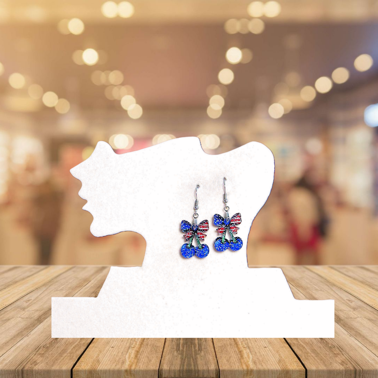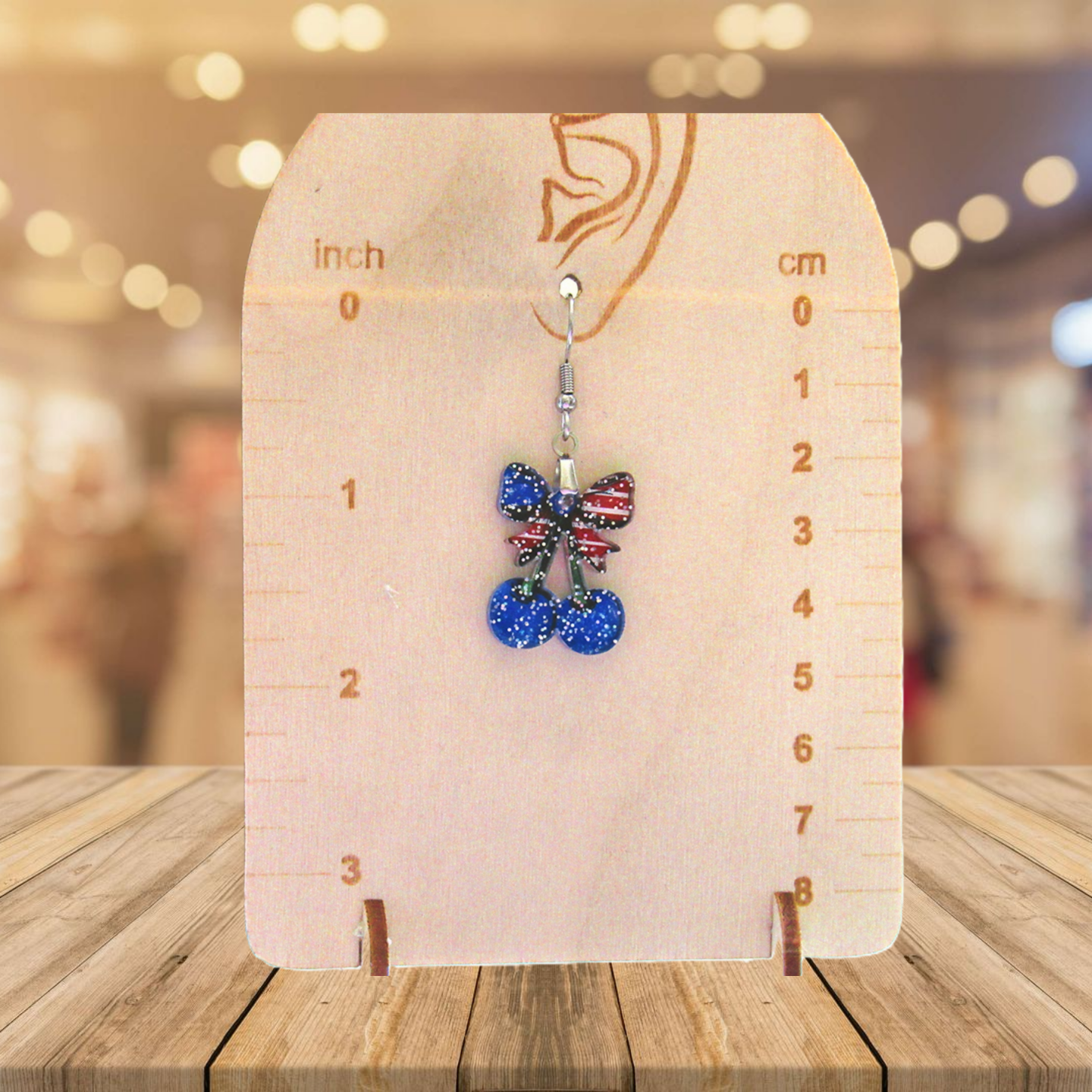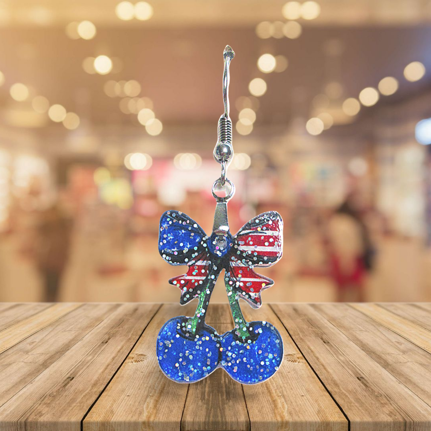 Add a splash of fun to your look with these playful acrylic cherry earrings! Measuring 1 inch at the base and 2 inches long, they feature vibrant blue cherries topped with a patriotic bow. Crafted with hypoallergenic wire, they’re gentle on sensitive ears while making a bold, festive statement. Perfect for adding a quirky touch to any outfit!