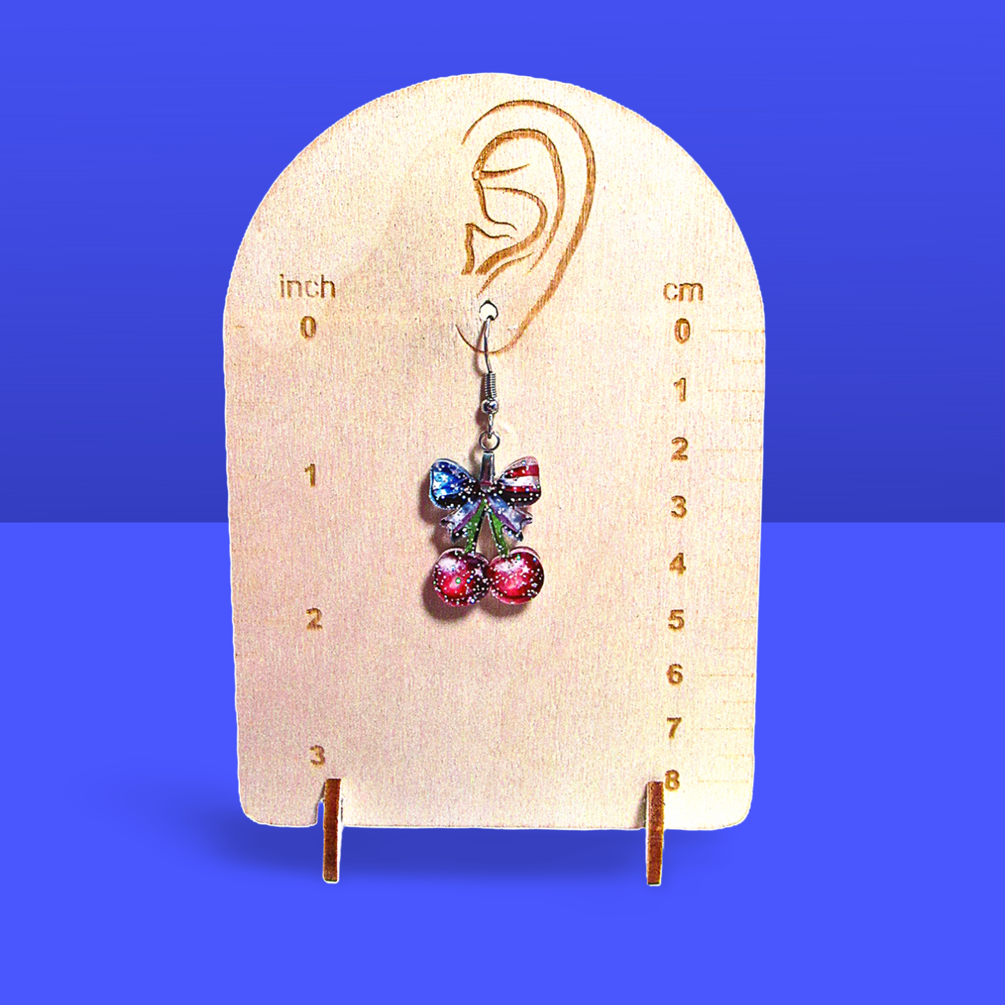 These retro-inspired earrings feature glitter acrylic cherries accented with a charming bow shape, measuring 2 inch in total length. Crafted with an inch base of durable MDF and hypoallergenic wire, they offer comfortable wear for sensitive ears. Celebrate your patriotic spirit with a stylish accessory that blends vintage flair and modern comfort perfectly.
