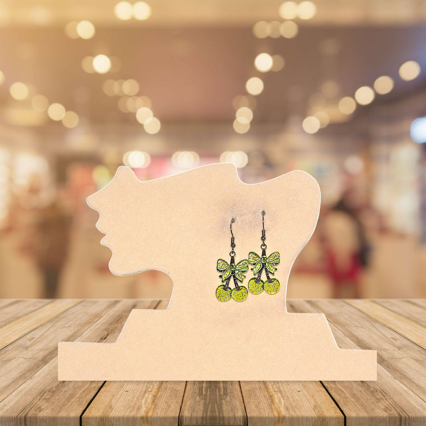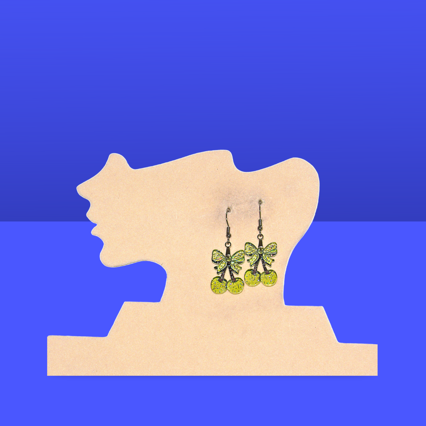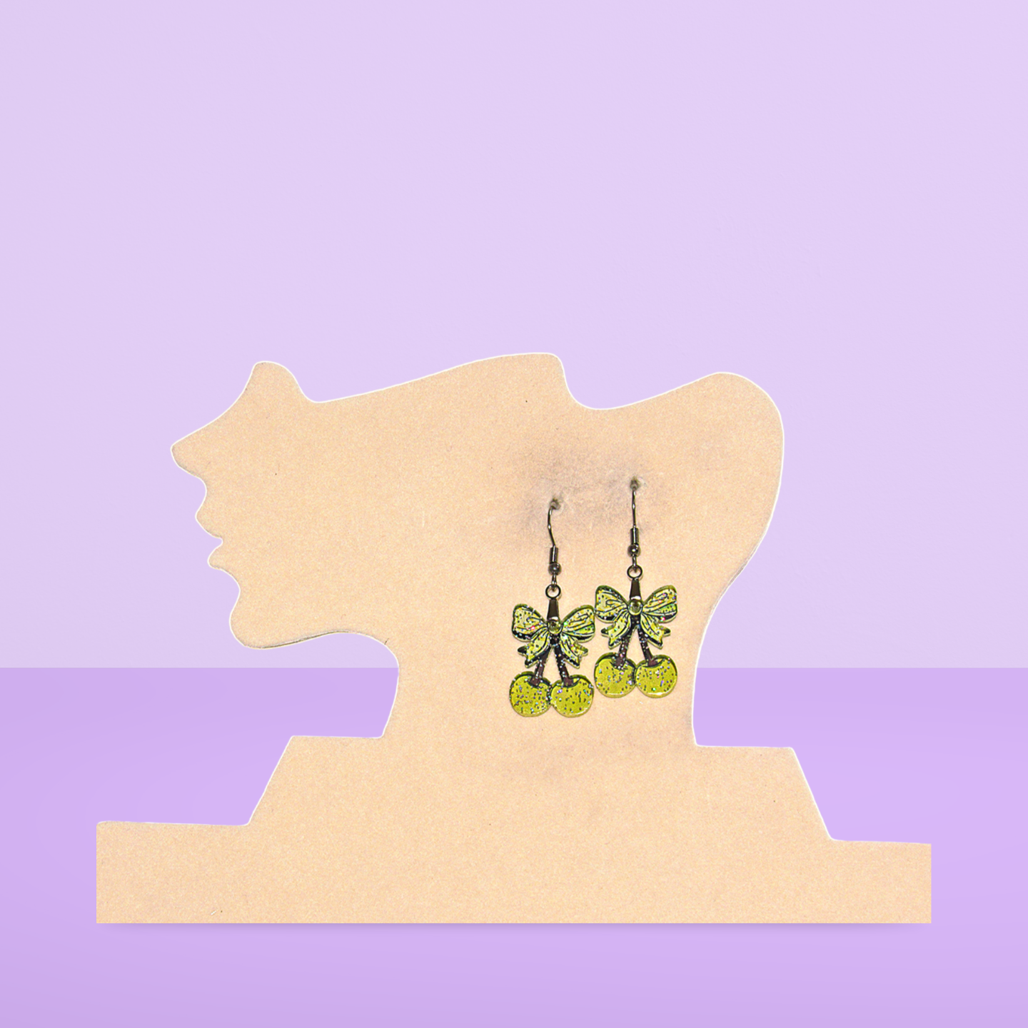 These charming earrings feature yellow cherry designs accented with a delicate yellow bow, crafted from durable acrylic with hypoallergenic wire for comfortable wear. Measuring 1 inch at the base and 2 inches in total length, they add a playful yet gentle touch to any outfit, perfect for those with sensitive skin.