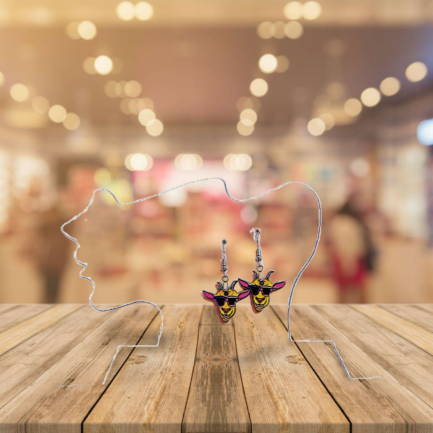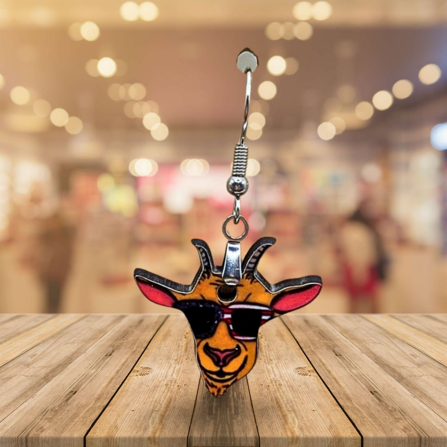 Add a quirky touch to your look with these playful goat head-shaped earrings. Crafted from lightweight MDF, each earring measures 1 inch at the base and 2 inches in total length, making them perfectly sized for everyday fun. Featuring a cool goat wearing sunglasses design, they hang from hypoallergenic wire to keep your ears happy and stylish all day long.