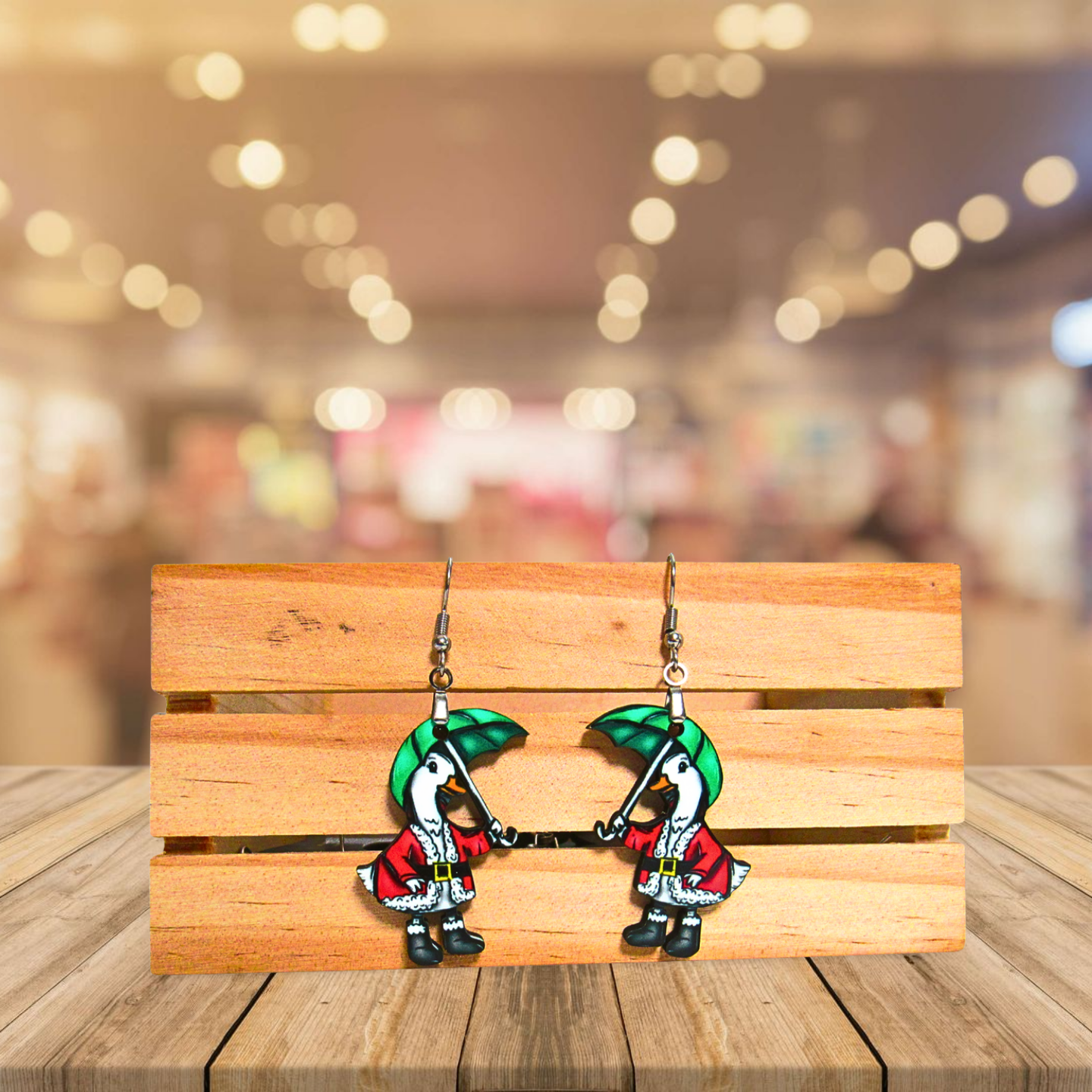 Add a playful touch to your style with these Goose with Umbrella-shaped earrings. Made from lightweight MDF, they measure 1.5 inches wide and 2.5 inches long, perfect for catching eyes without weighing you down. Featuring hypoallergenic wire, they’re gentle on sensitive ears, so you can enjoy these charming earrings all day long. A quirky accessory that brightens up any outfit!