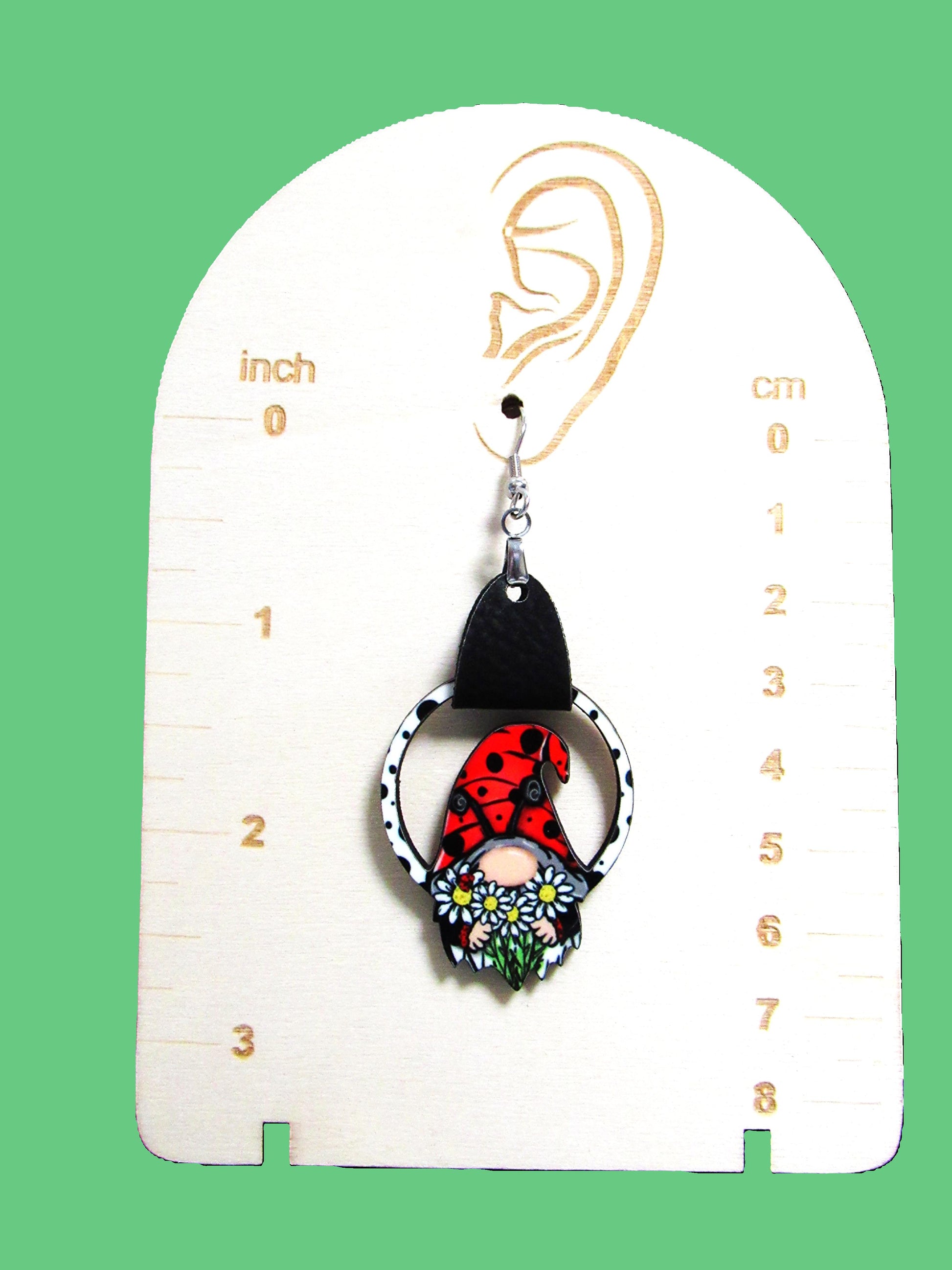 These playful round gnome-shaped earrings feature a 1.5-inch MDF base with a total length of 2.75 inches. Designed for comfort, they include hypoallergenic wire and a faux leather strap to keep them lightweight and fun to wear. Adorned with a charming gnome holding daisies, they add a whimsical touch to any outfit, perfect for expressing your unique style with a sprinkle of garden magic.