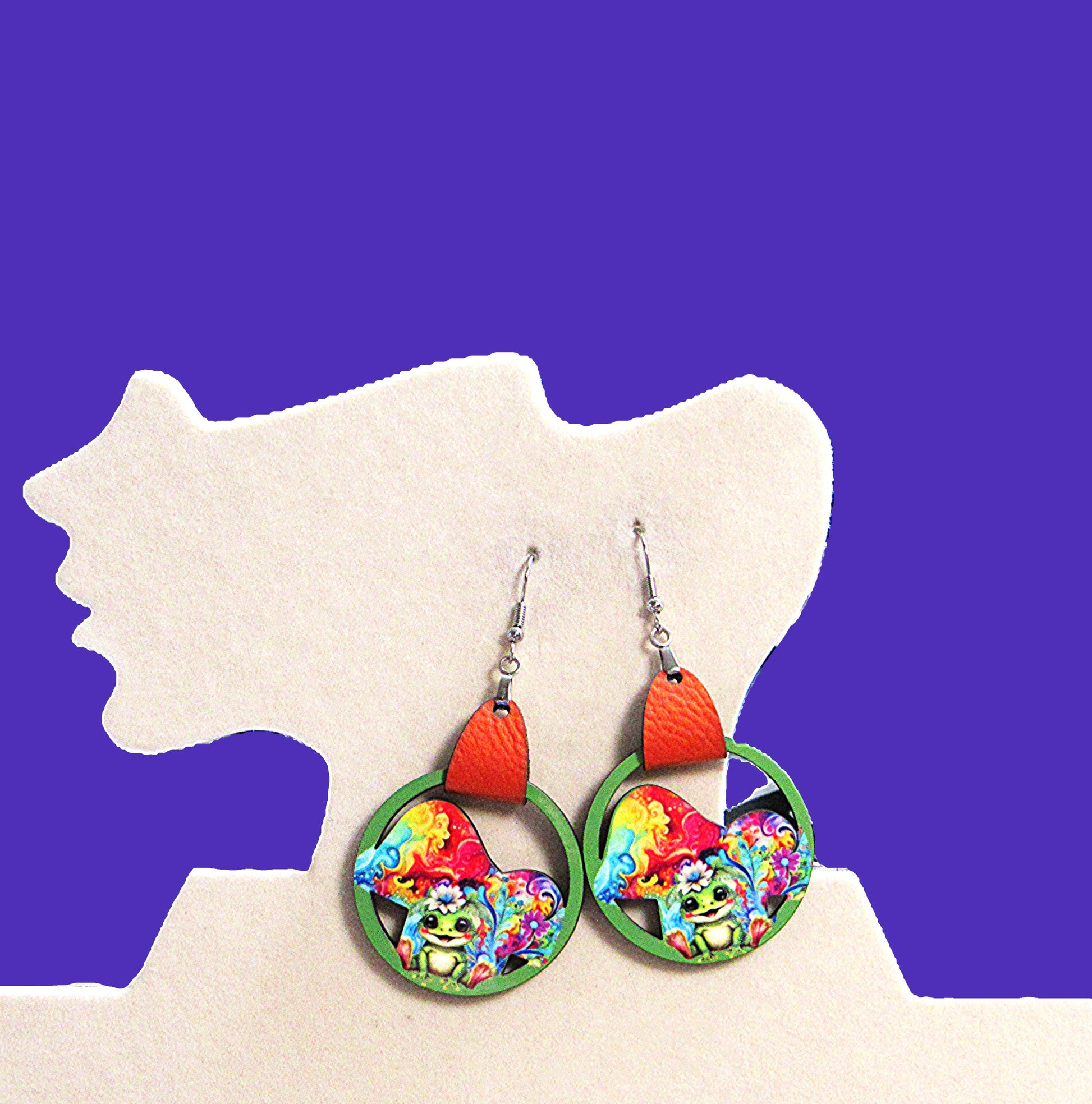 Add a touch of whimsy to your look with these playful hippie frog earrings. Crafted from lightweight MDF with a 1.5-inch base and a total length of 2.75 inches, they feature a faux leather strap and hypoallergenic wire for comfortable, irritation-free wear. Perfect for those who love fun, unique accessories that stand out!