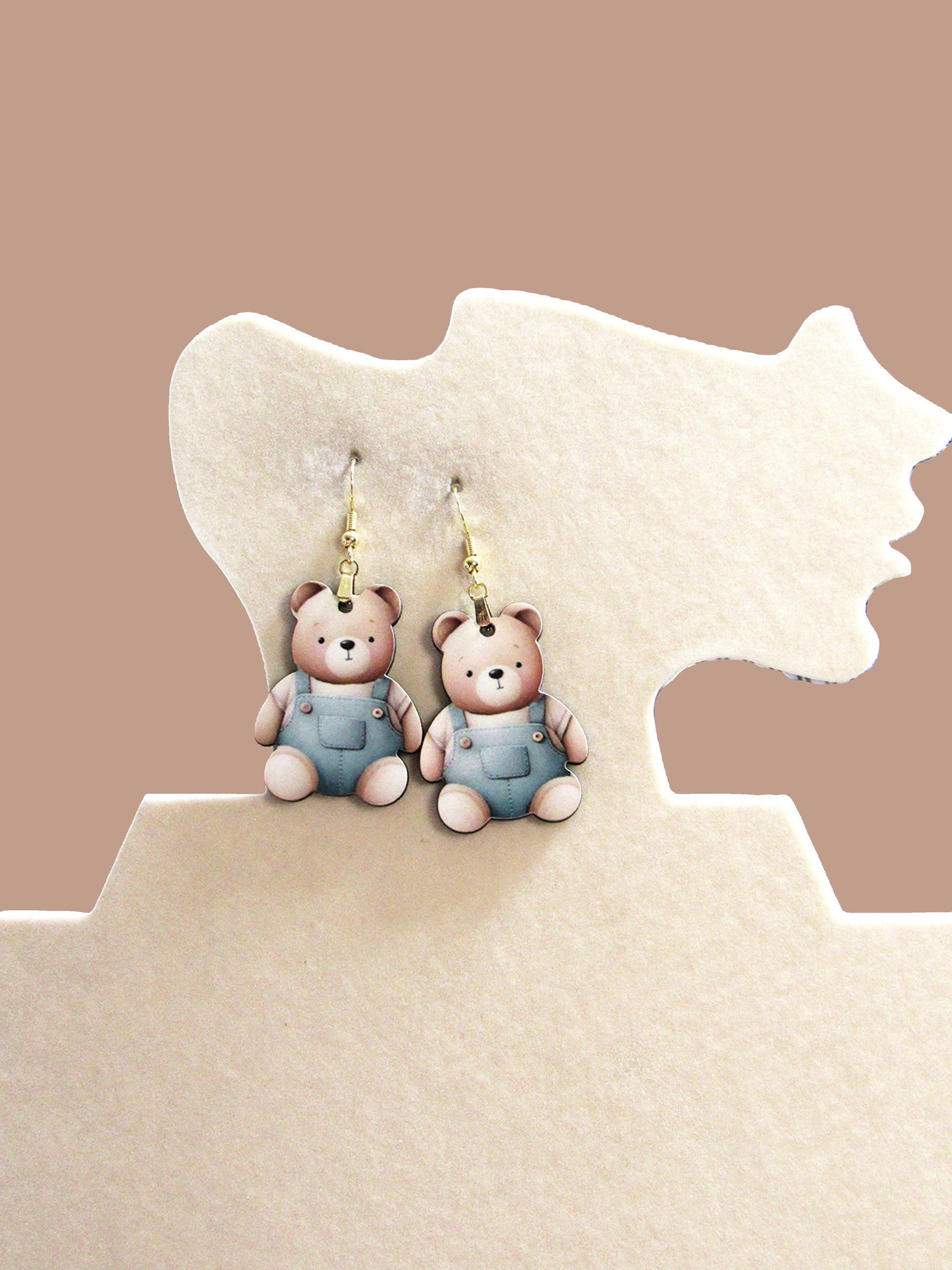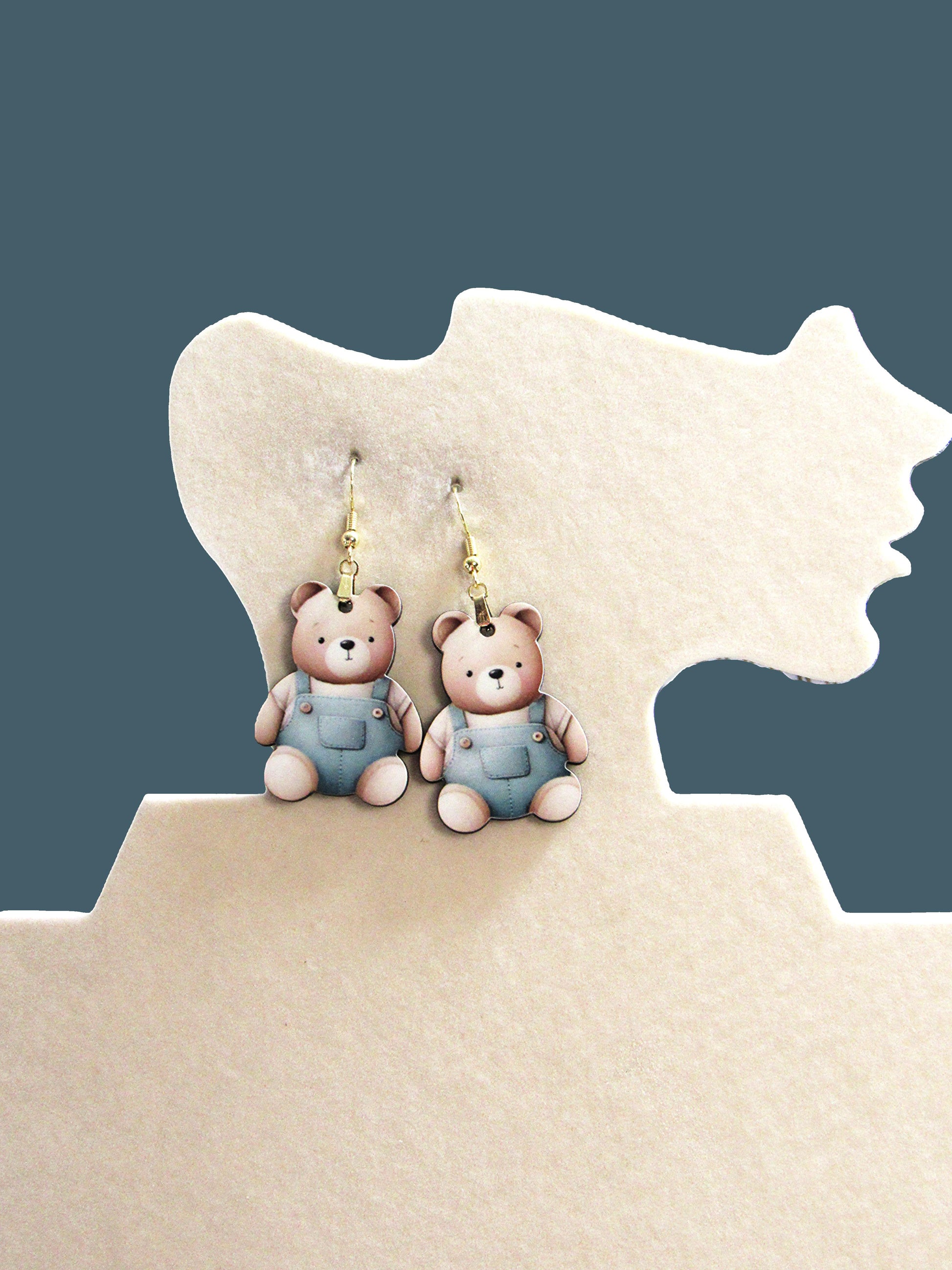 These charming teddy bear earrings, measuring 1.5 inches with a total length of 2.5 inches including the hypoallergenic wire, feature a delightful teddy bear wearing blue overalls. Made from lightweight MDF, they offer both comfort and style, perfect for everyday wear. The hypoallergenic wire ensures irritation-free use, making these earrings an ideal choice for sensitive ears. Add a playful and unique touch to your look with these carefully crafted, eye-catching accessories.