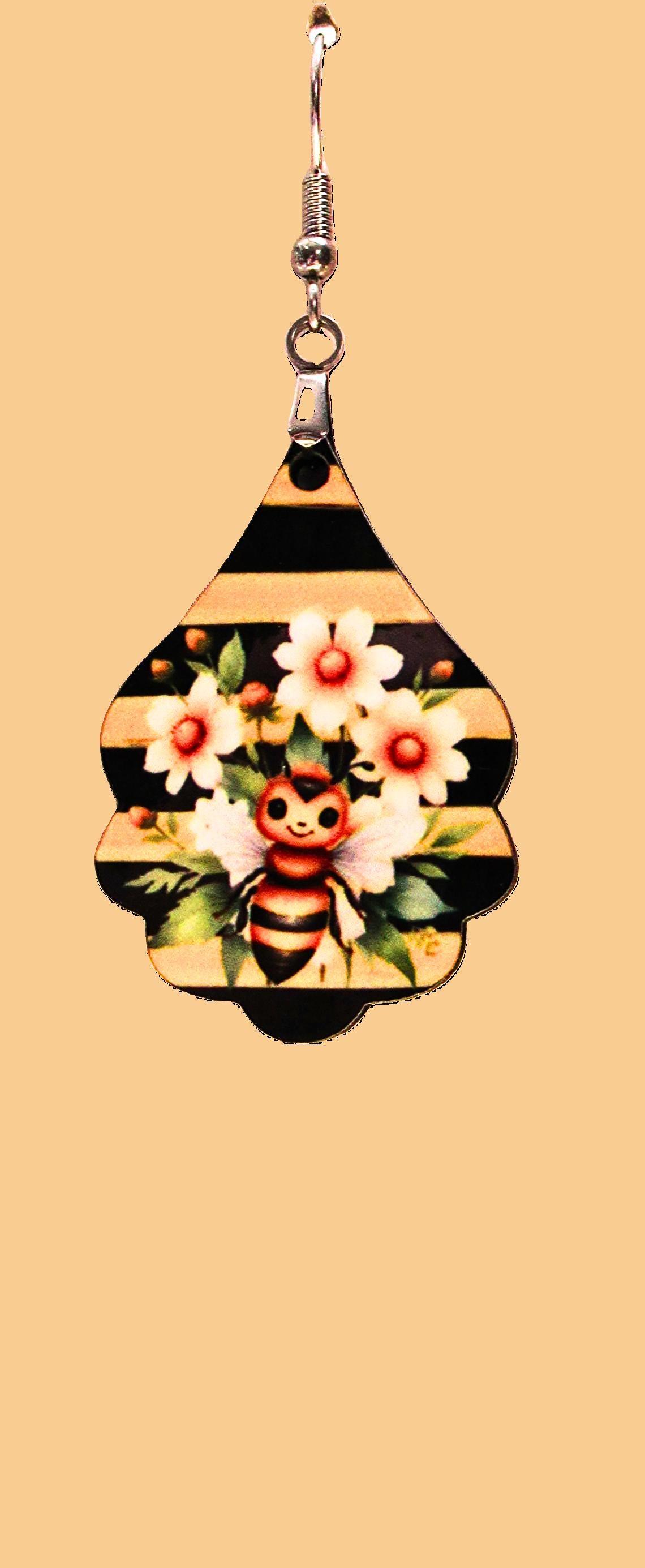 These Fancy Teardrop Shaped Sublimated Earrings buzz with playful charm, featuring a bright yellow and black bee resting on a delicate flower. Measuring 1.5 inches wide and 2.5 inches long, they’re crafted from lightweight MDF and finished with hypoallergenic wire for comfortable all-day wear. Add a sweet, sunny touch to any outfit with these delightful earrings.