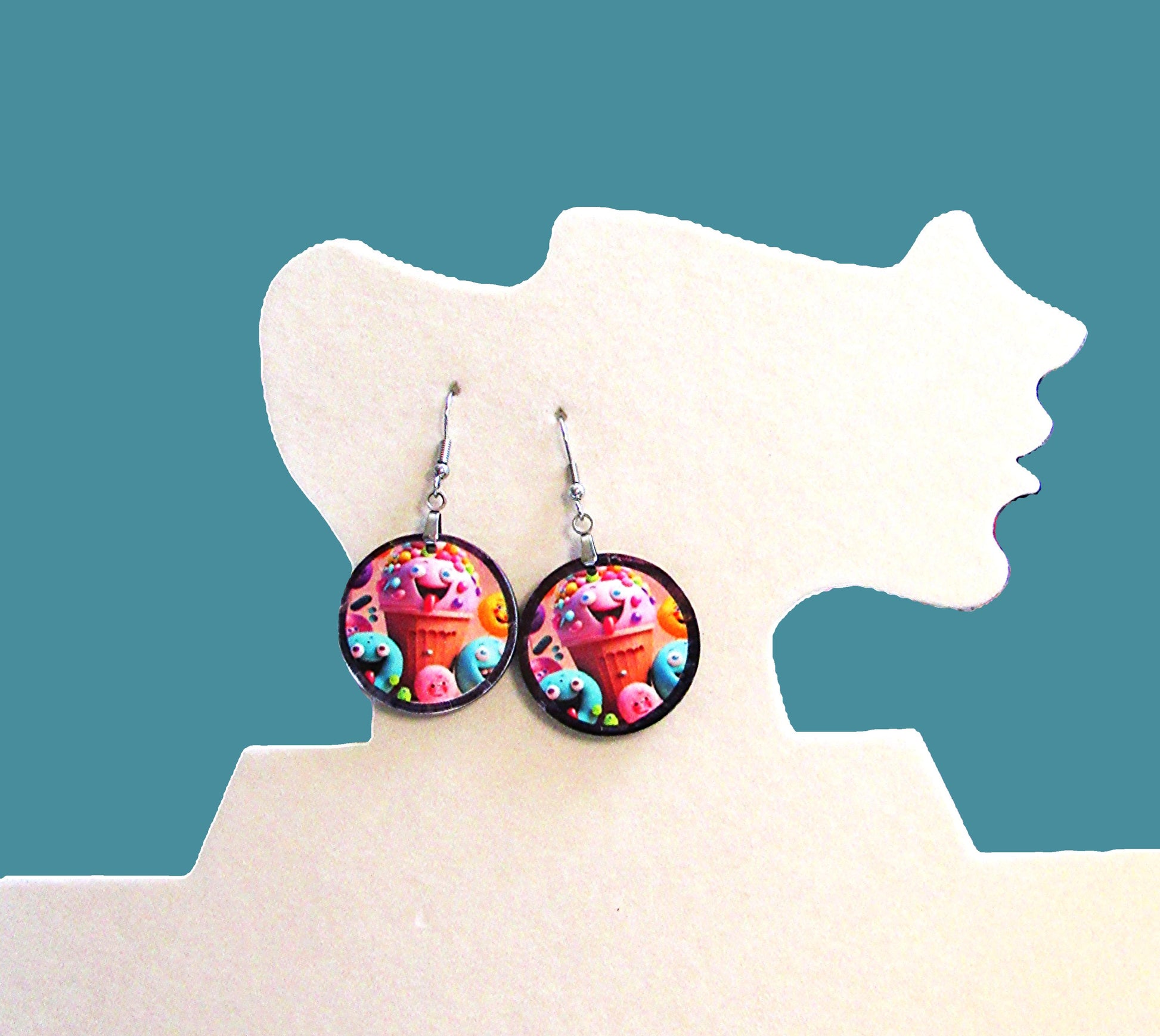 These playful round sublimated earrings boast a 1-inch MDF base with a total length of 2 inches and hypoallergenic wire for all-day comfort. Featuring a fun ice cream theme, they add a sweet and quirky pop to your look that's perfect for any sunny day or playful outfit.