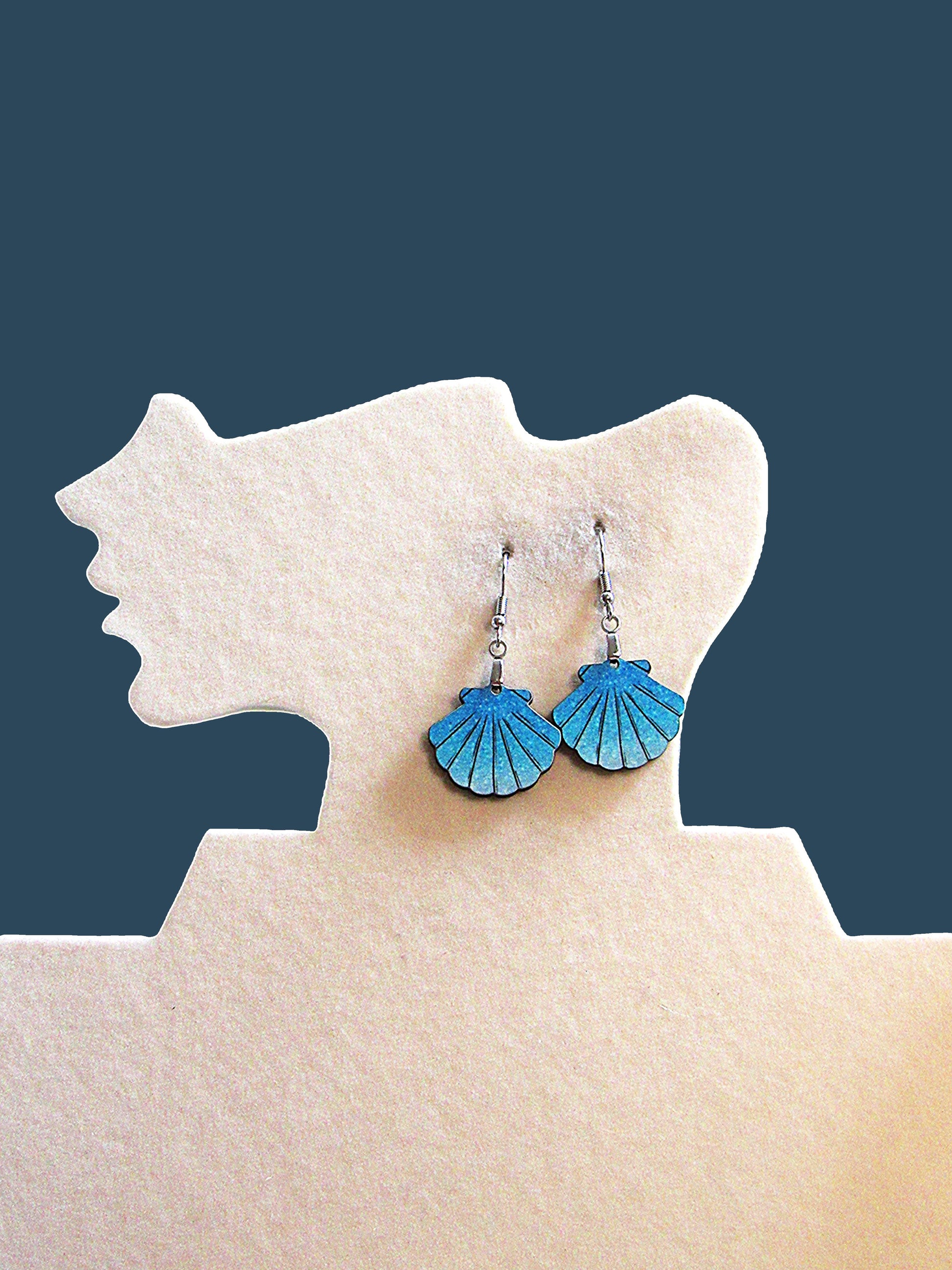 These clam shell-shaped earrings are crafted from durable MDF and measure 1 inch in base and total length, offering a comfortable and lightweight feel. They feature hypoallergenic wire, making them suitable for sensitive ears. The blue glitter finish adds a subtle sparkle, perfect for everyday wear or special occasions.