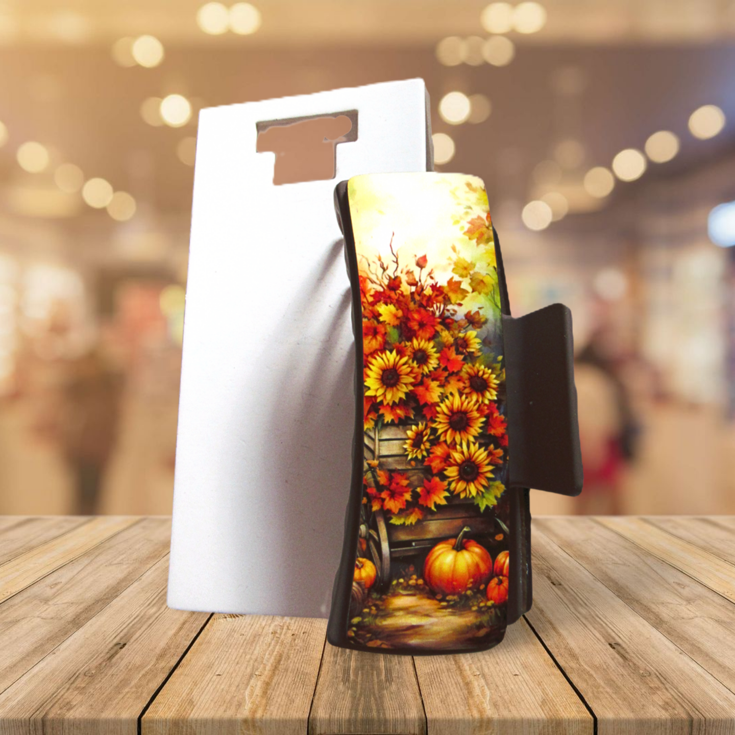 Celebrate the cozy spirit of fall with this Large Sublimated Hair Claw Clip, adorned with Fall Sunflowers design. Crafted from durable plastic, alloy, and MDF, it features a sturdy metal spring and interlocking teeth to keep your hair perfectly in place. Measuring about 4.1 inches, this playful clip is both a charming and reliable way to add autumn flair to your look!