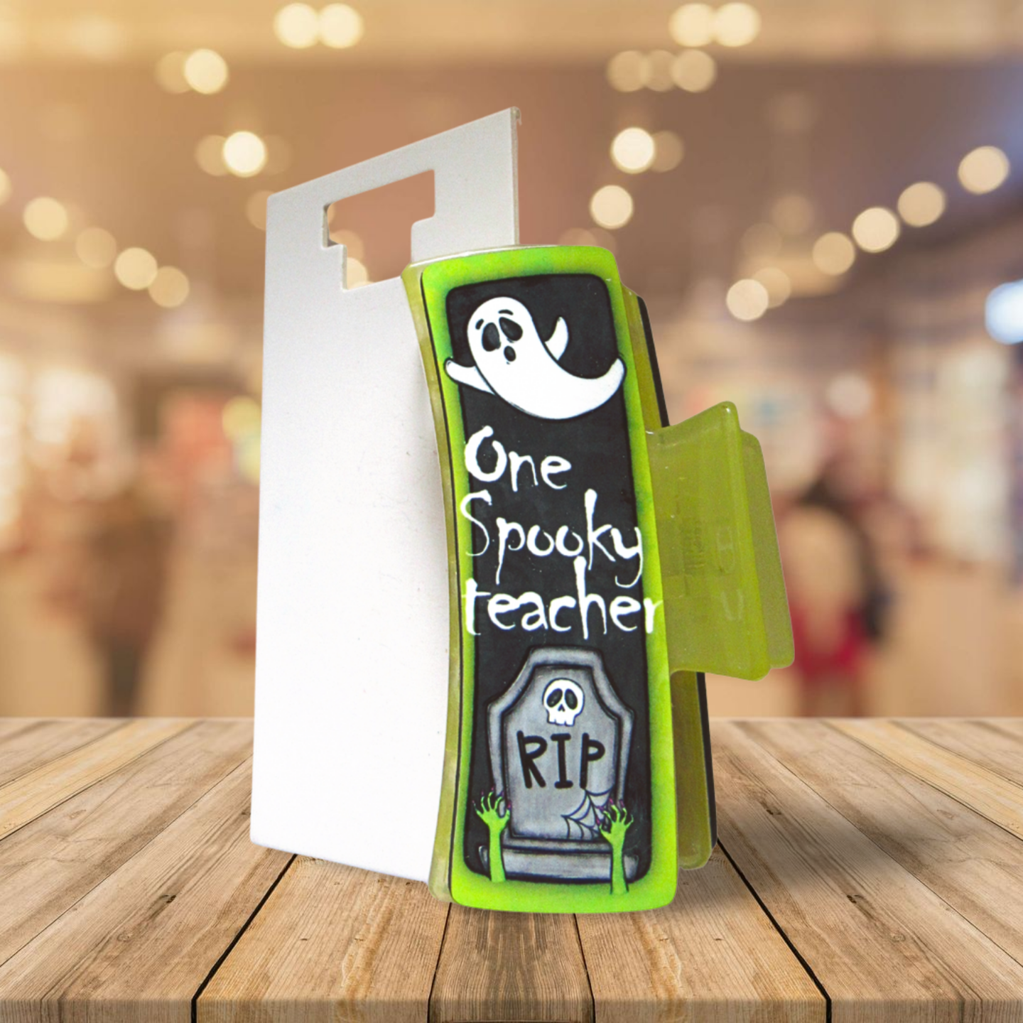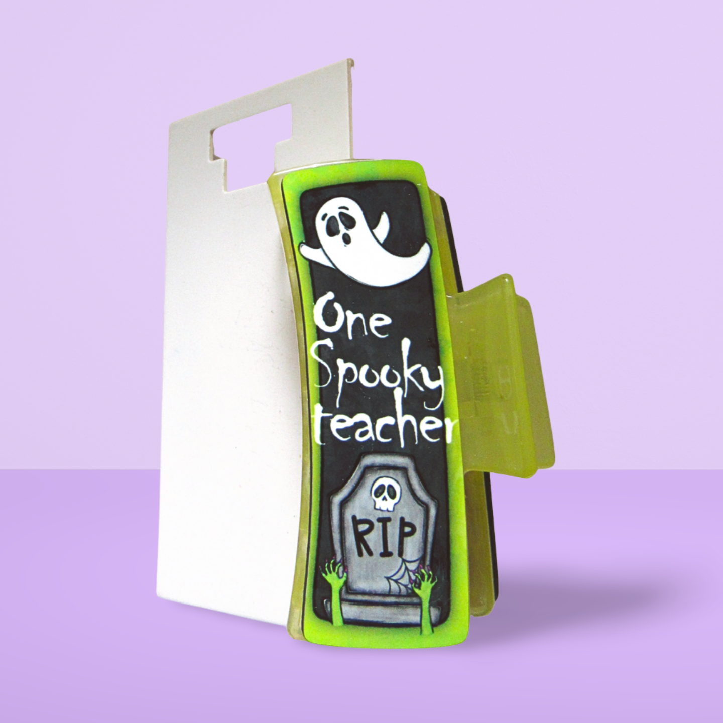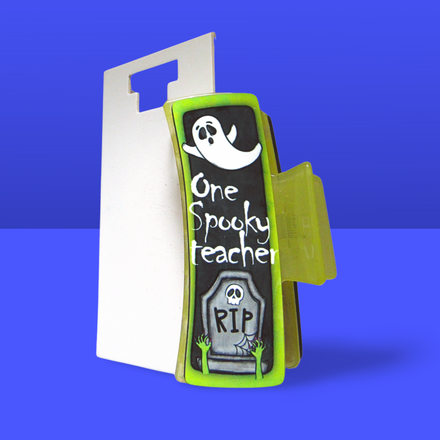 Celebrate the cozy spirit of fall with this Large Sublimated Hair Claw Clip, adorned with a "One Spooky Teacher" design. Crafted from durable plastic, alloy, and MDF, it features a sturdy metal spring and interlocking teeth to keep your hair perfectly in place. Measuring about 4.1 inches, this playful clip is both a charming and reliable way to add autumn flair to your look!
