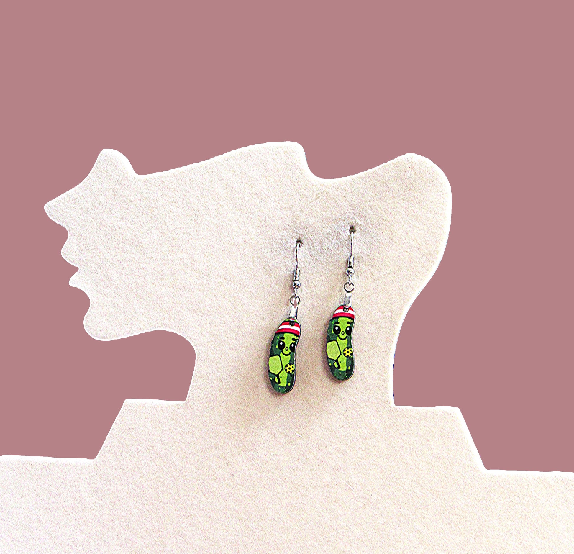 Add a quirky twist to your look with these pickle-shaped earrings! Crafted from sturdy MDF with a 1.5-inch base and a total length of 2.5 inches, they’re lightweight and comfortable to wear. Featuring hypoallergenic wire, these playful accessories are perfect for sensitive ears and guaranteed to spark smiles wherever you go.