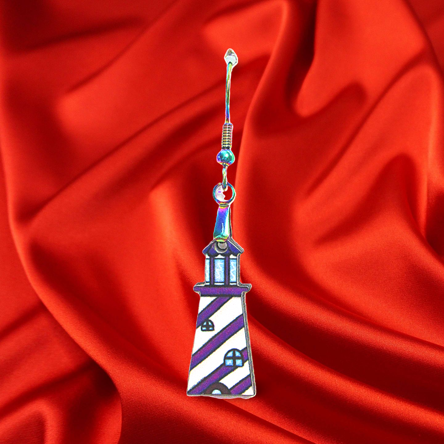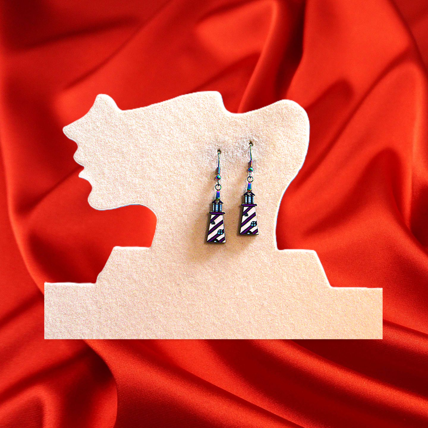 These charming lighthouse-shaped earrings, crafted from MDF with a 1-inch base and 2 inch total length, come adorned with a playful purple stripe theme and hypoallergenic wire for comfortable wear. Perfect for adding a splash of seaside fun to any outfit!