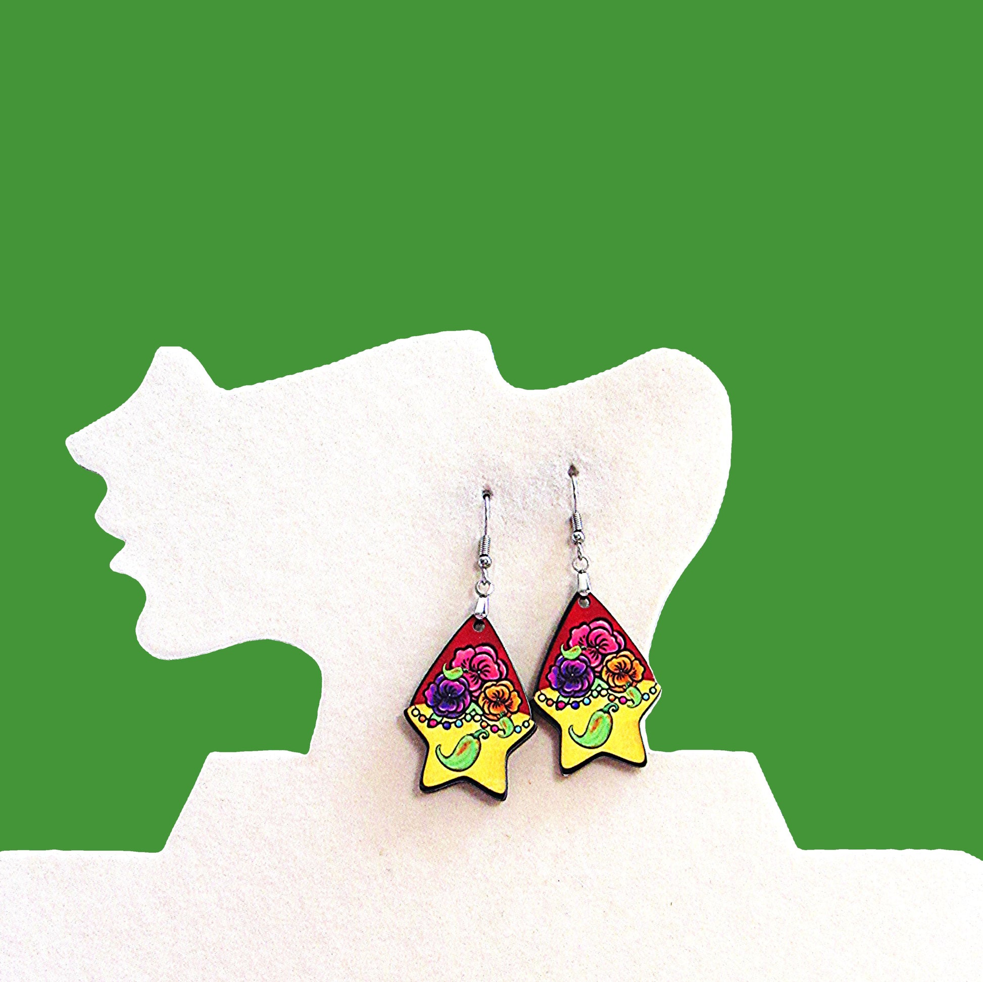 These playful Teardrop Star Shaped Sublimated Earrings bring a fun Day of the Dead vibe to your look. Crafted from lightweight MDF with hypoallergenic wire, they measure 1.5 inches at the base and 2.5 inches in total length, making them comfortable for all-day wear. Add a touch of festive charm and unique style to your outfit with these eye-catching earrings.