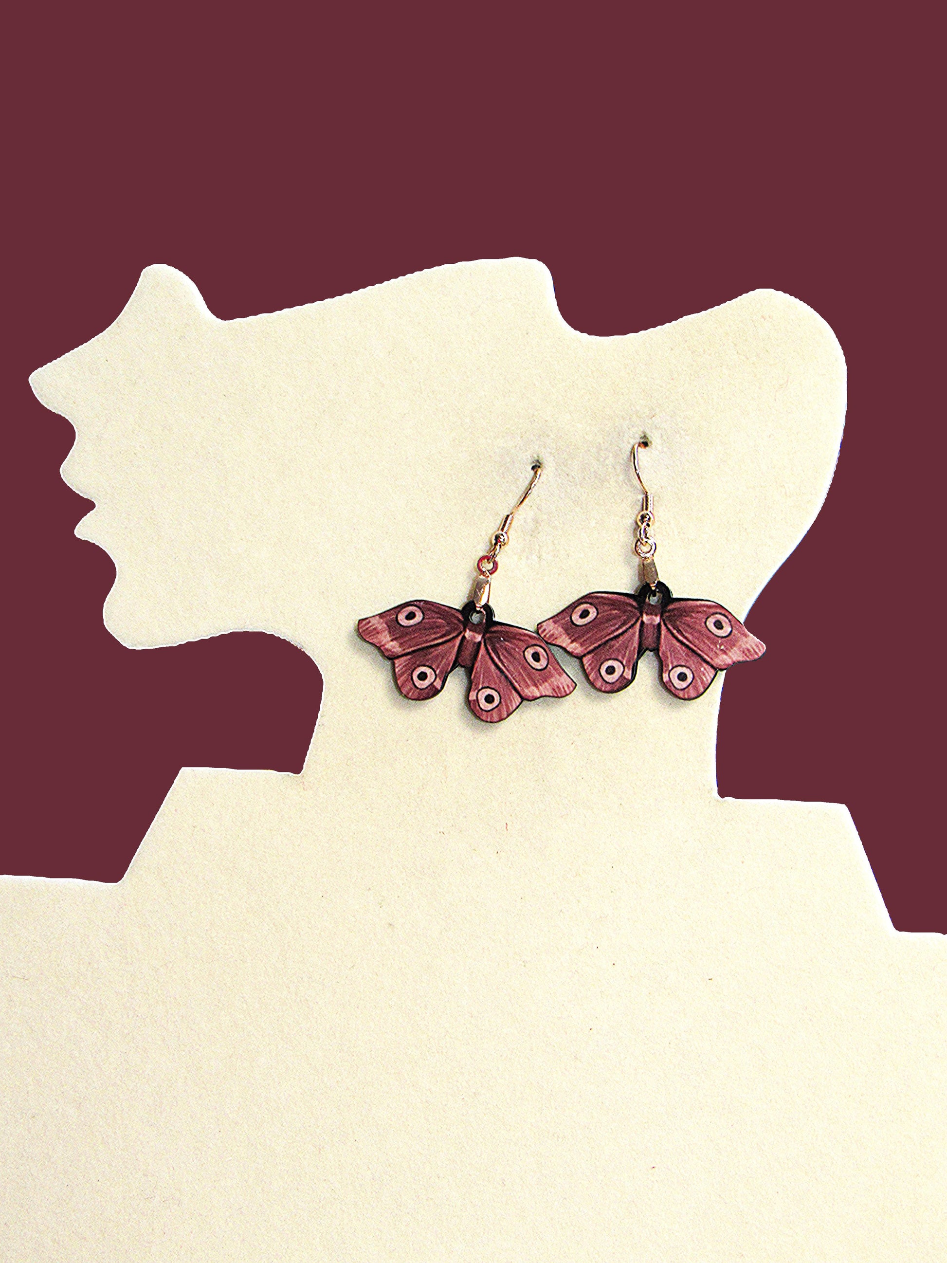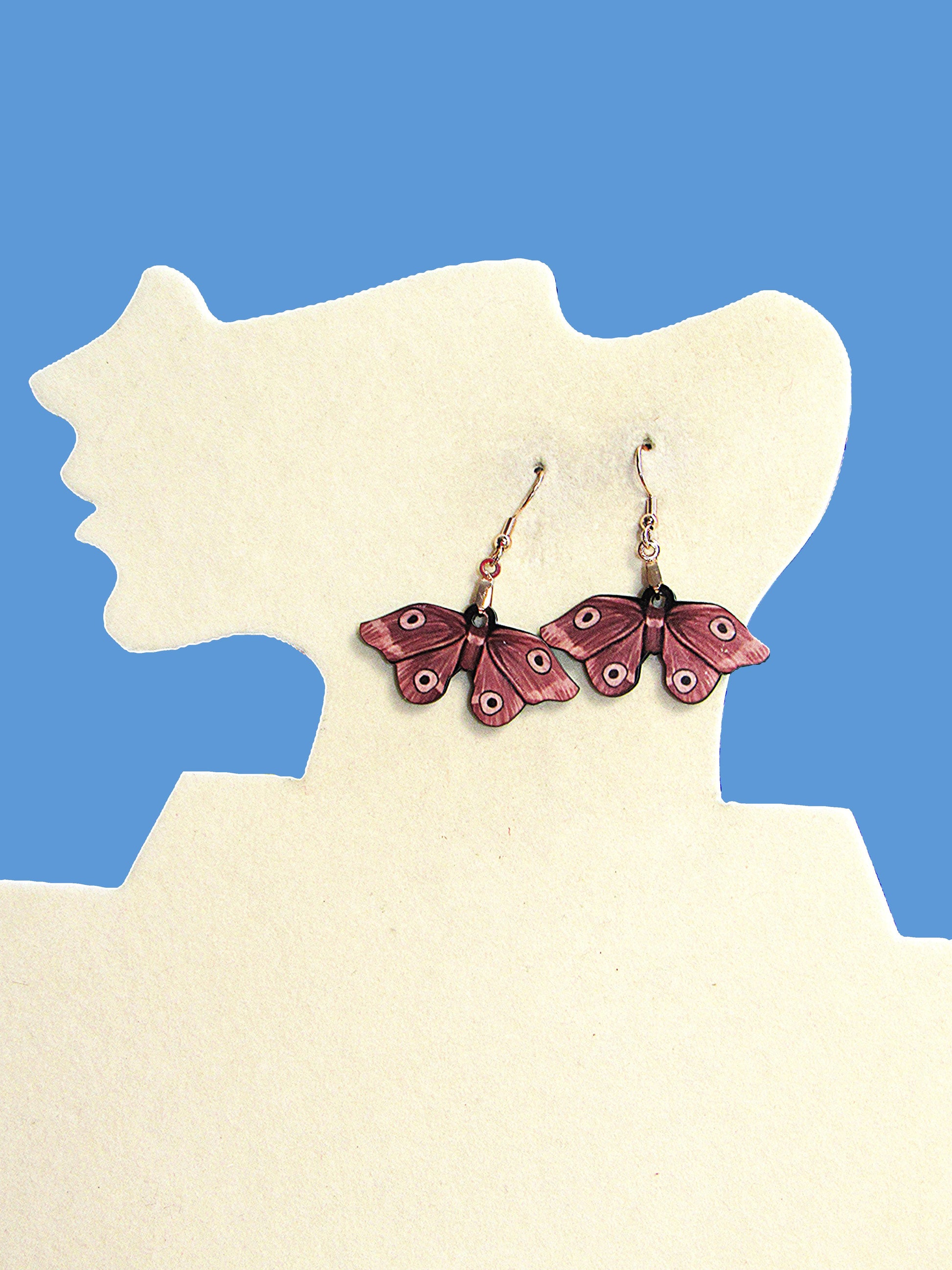 These charming moth-shaped earrings measure 1.5 inches wide and 1.75 inches long, crafted from smooth MDF with hypoallergenic wire for comfortable wear. Their playful design adds a whimsical touch to any outfit, perfect for those who love unique, lightweight accessories that stand out with subtle flair.