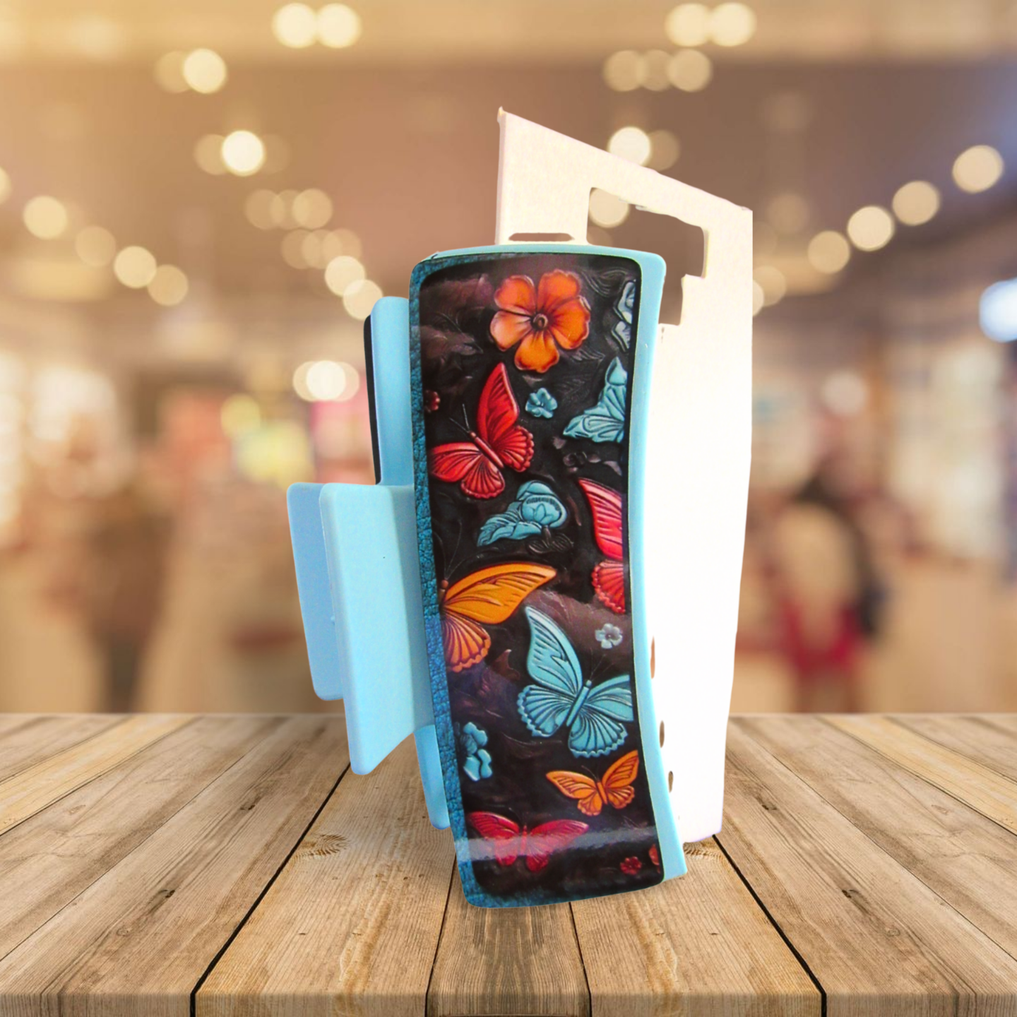 Add a touch of fun to your hairstyle with this 4-inch Leather Look Hair Clip featuring a charming butterfly theme. Made from durable plastic, alloy, and MDF, it includes a sturdy metal spring and interlocking teeth to keep your hair securely in place all day. Perfect for adding a playful accent to any look!