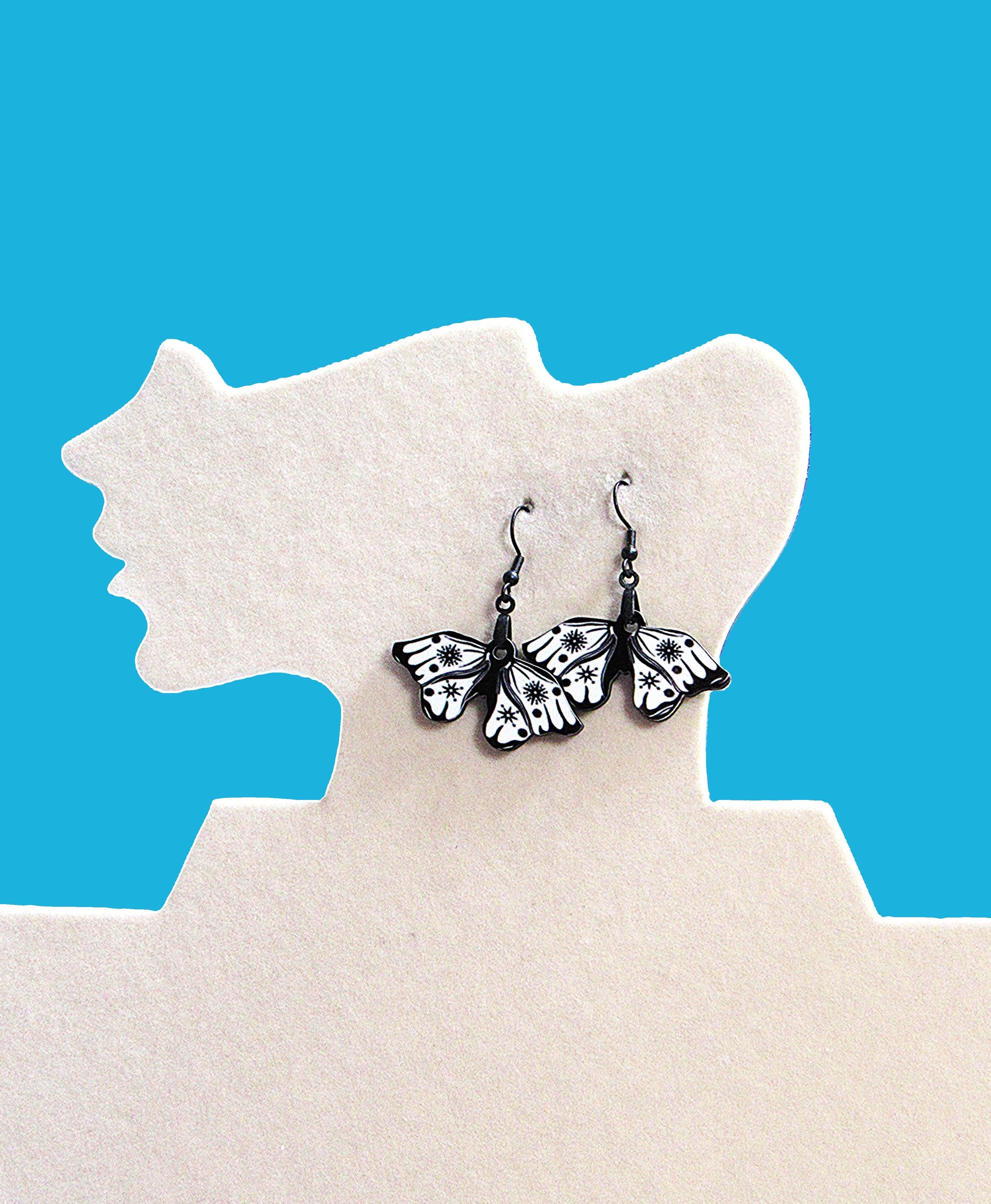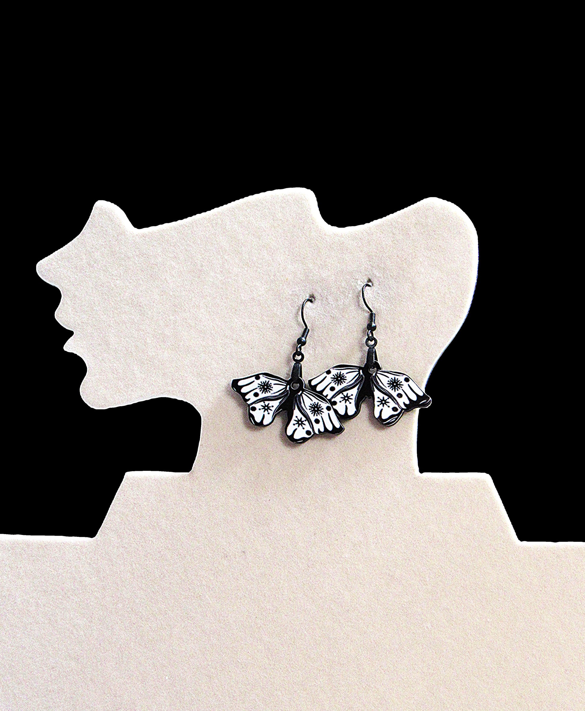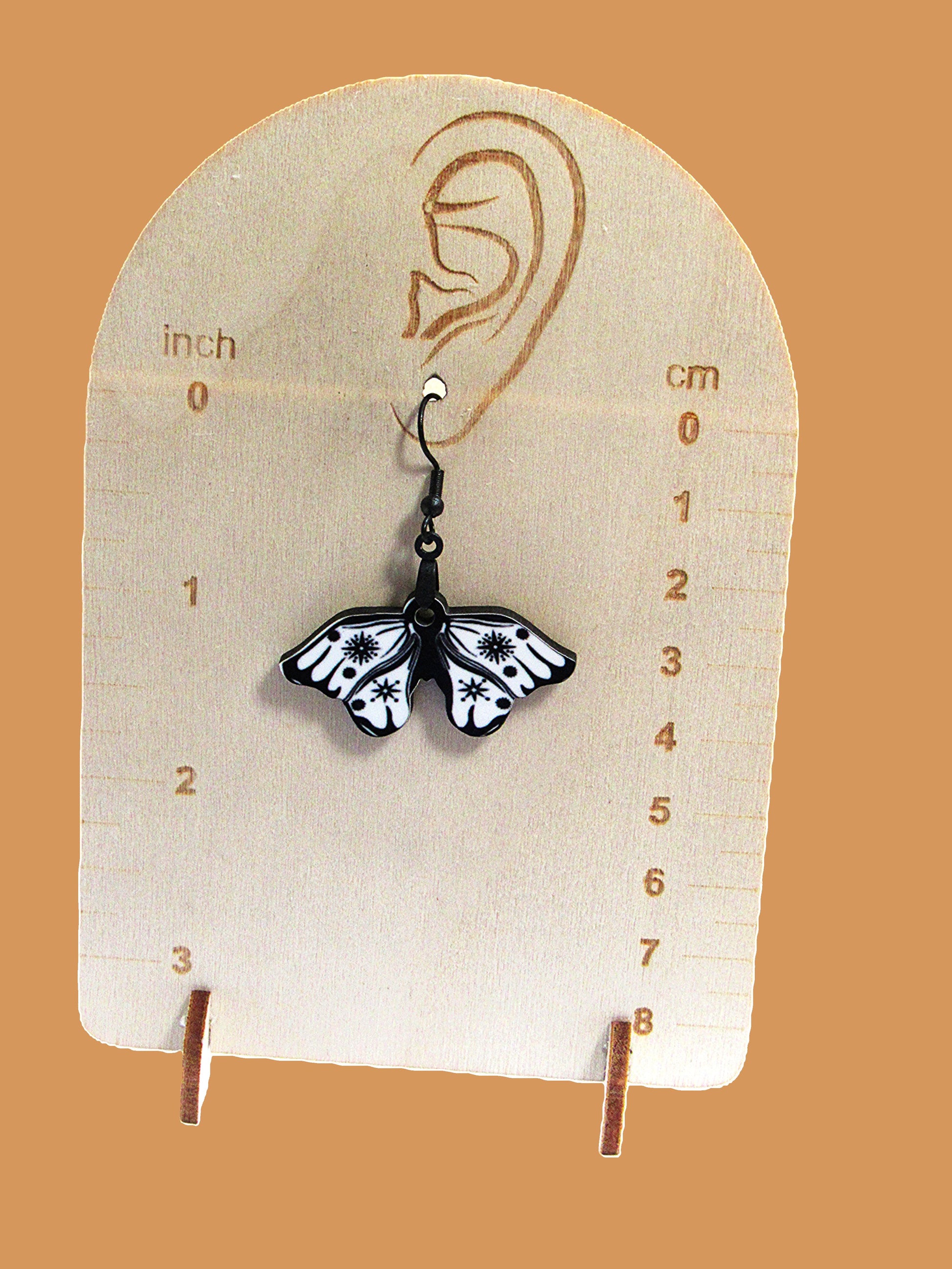 These charming moth-shaped earrings are crafted from durable MDF, measuring 1.5 inches wide and 2 inches long for a bold yet lightweight look. Featuring hypoallergenic wire, they’re perfect for sensitive ears and add a whimsical touch to any outfit. Playfully unique and comfortable, these earrings make a delightful statement wherever you go.