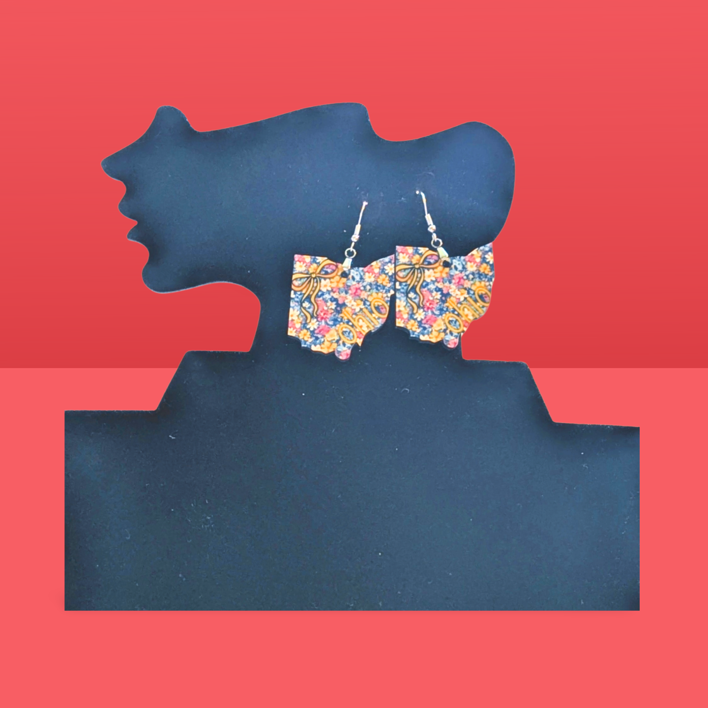 Add a splash of charm to your look with these Ohio-shaped earrings! Crafted from lightweight MDF, each 2.5-inch earring features a bright floral design accented with a cheerful yellow ribbon, sublimated on one side for vibrant detail. Finished with hypoallergenic wire, they’re gentle on sensitive ears while making your style blossom with playful flair. Perfect for those who love a fun and fresh accessory that stands out!
