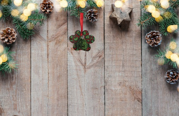Celebrate the special bond with your furry friend using this Paw Print Shaped Sublimated Ornament. Crafted from sturdy MDF with one-sided printing, it features the heartfelt phrase "Love has Four Paws." Measuring 3 x 3 inches, it includes an attached heart charm and is finished with a red ribbon, ready to hang and add a warm, loving touch to your space.