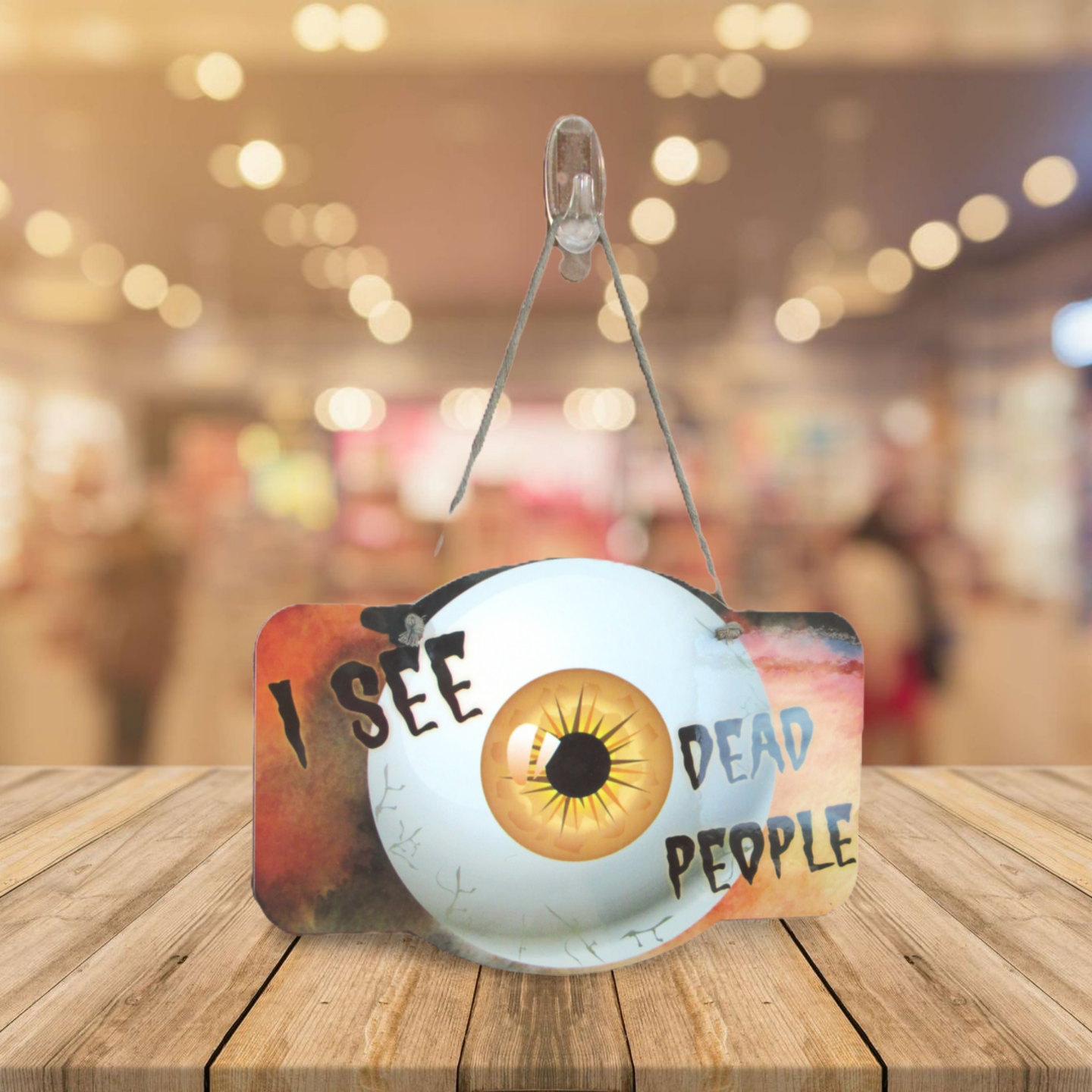This playful MDF door hanger measures 10.5 x 7.25 inches and features a sublimated design on one side with a spooky eye and the phrase “I See Dead People.” Completed with a jute rope and beads, it’s ready to hang and add a fun, haunting touch to your door or wall.